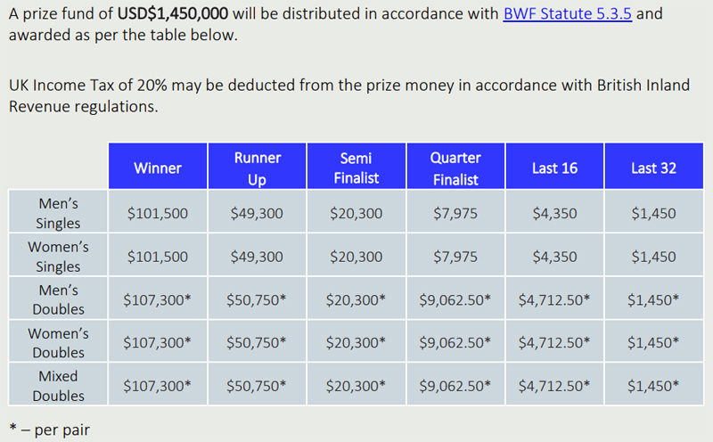• ระดับของรายการ : HSBC BWF World Tour Super 1000 (Grade 2 Level 2)