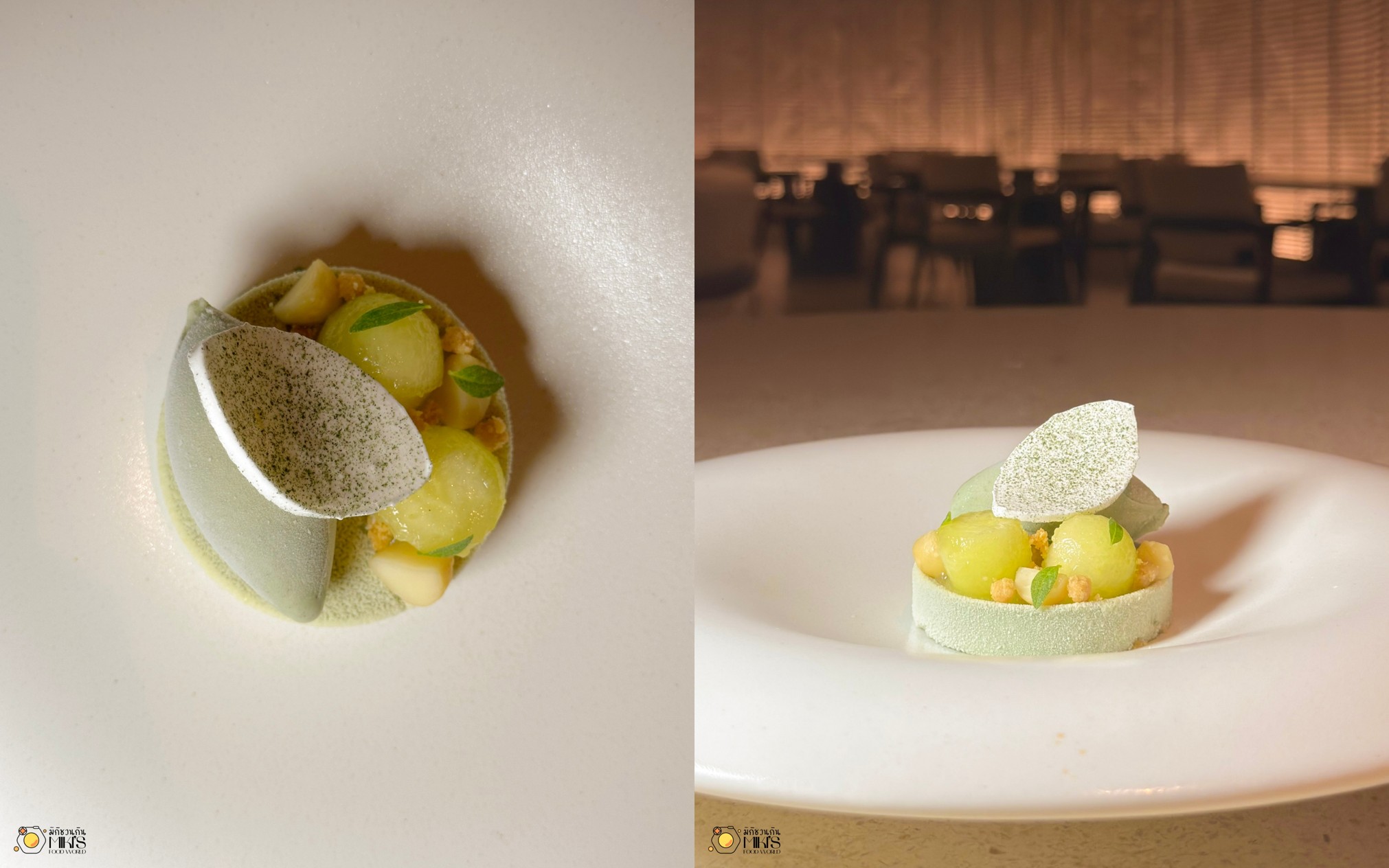 Kiwi (Mango, Bergamot, Chervil) ขนมหวานที่สวยเหมือนงานศิลปะ กีวีอบกรอบรูปดอกไม้ ทานคู่กับโยเกิร์ตและกรานิต้ามะม่วง สดชื่นแบบตะโกน