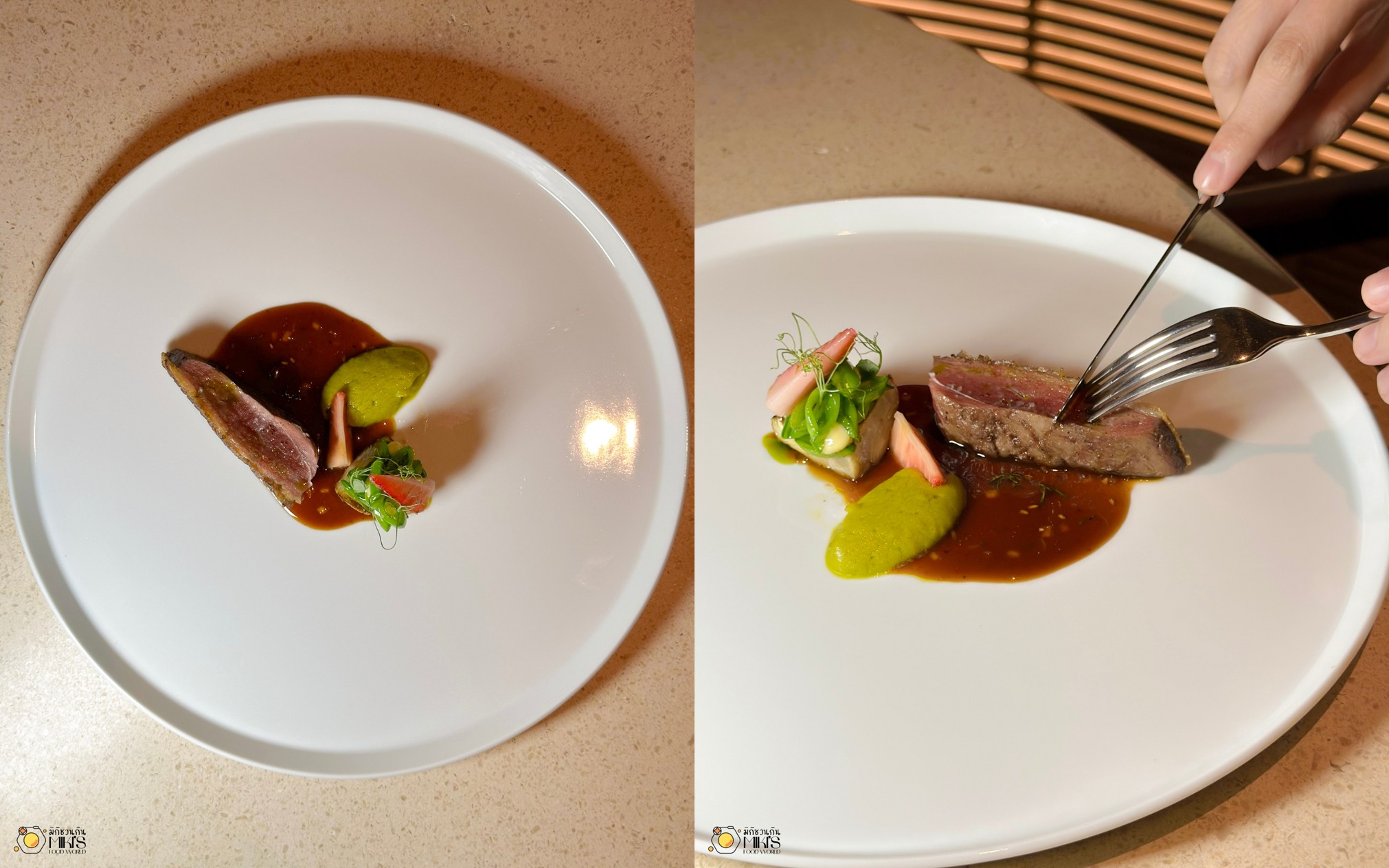 Duck (Strawberry, Pea, Artichoke) เชฟใช้เนื้อเป็ด Dry-aged 12 วัน จนได้เนื้อที่รสเข้มข้น ปรุงให้ได้เนื้อที่นุ่ม และหนังกรอบมาก ทานคู่กับซอสสตรอว์เบอร์รี่รสเปรี้ยวหวาน เป็นการจับคู่กันที่ลงตัวที่สุด