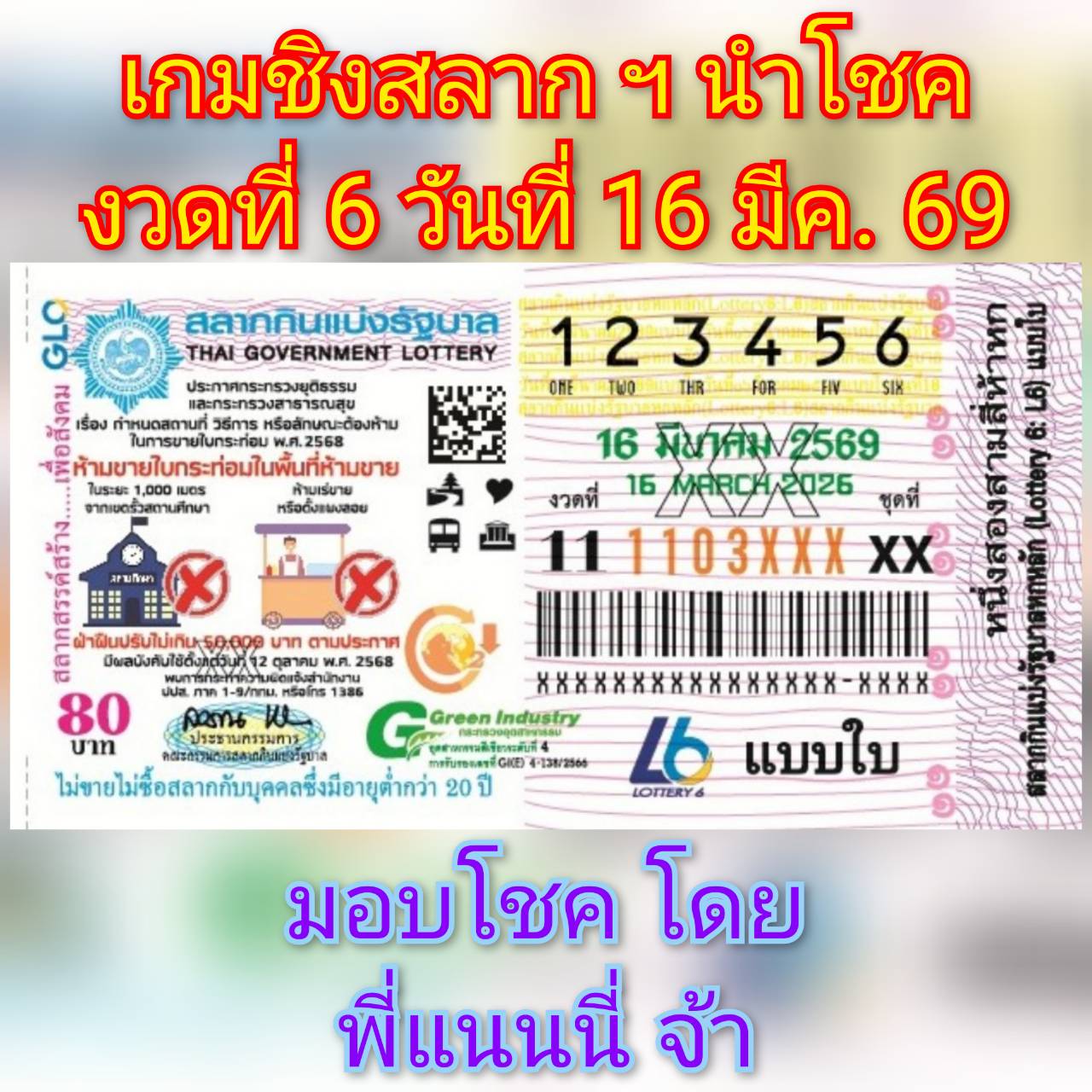รางวัล :- สลาก ฯ นำโชค งวดที่ 6 วันที่ 16 มีนาคม 2569 จำนวน 3 รางวัล ๆ ละ 3 ใบ และ กิตติมศักดิ์ 2 รางวัล คือ ป้าใหม่ และ ลุงชู (หนุ่มแม่ริม)ครับ