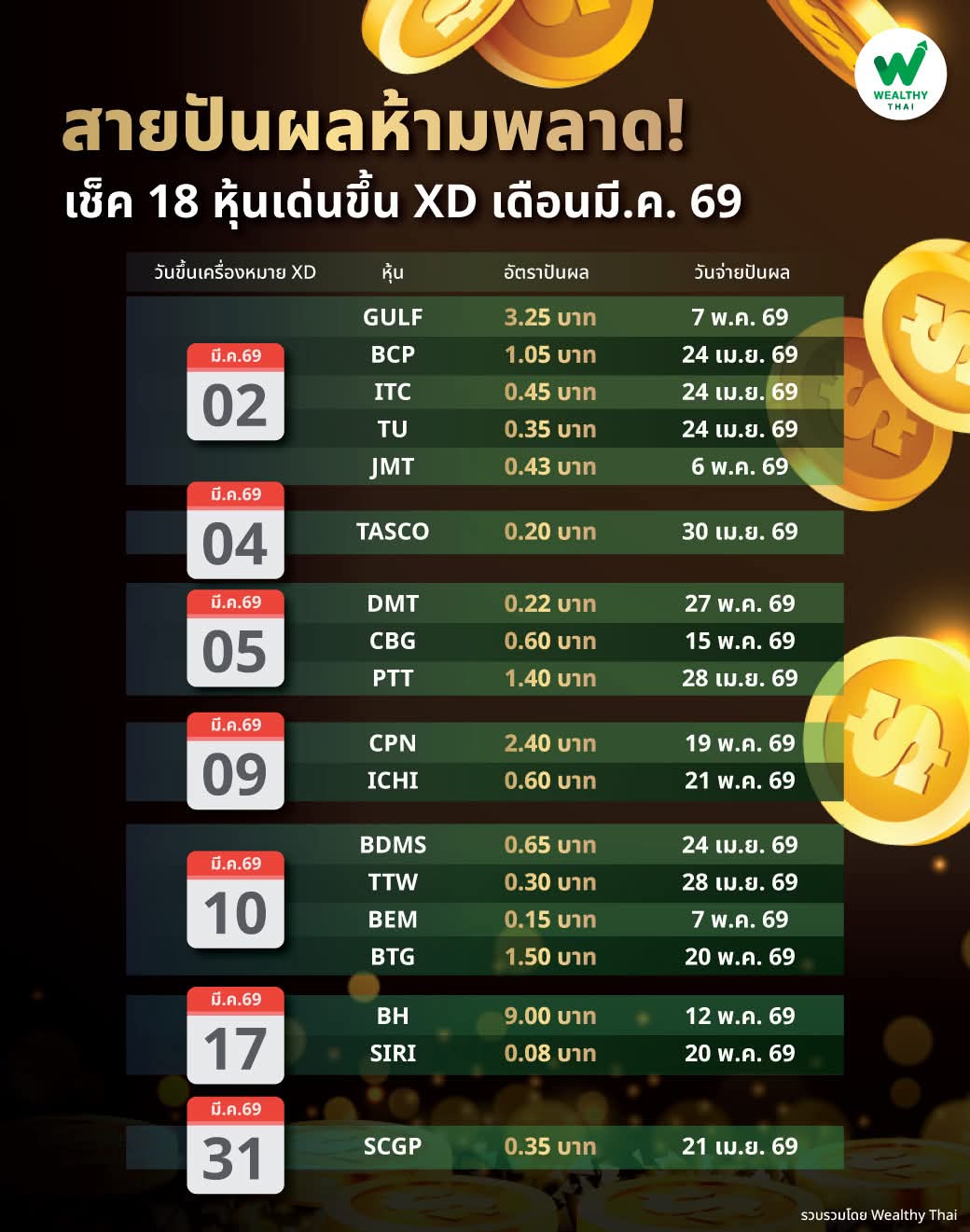 ซึ่งวันนี้ Wealthy Thai ได้รวบรวมข้อมูลของ 18 หุ้นที่ได้รับความสนใจจากนักลงทุนและจะขึ้นเครื่องหมาย XD ในเดือนมีนาคม 2569 มานำเสนอ