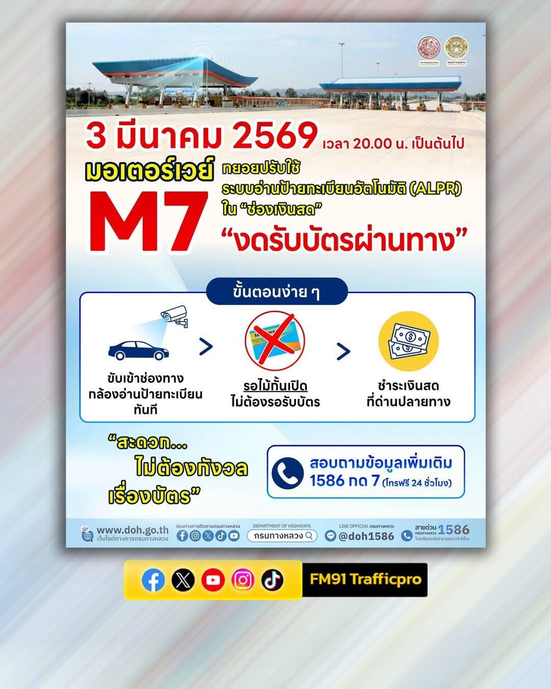 กรมทางหลวง ดีเดย์ 3 มี.ค. นี้! มอเตอร์เวย์ M7 นำร่องระบบ ALPR ช่องเงินสด “ขับผ่านฉลุย ไม่ต้องหยุดรับบัตร"