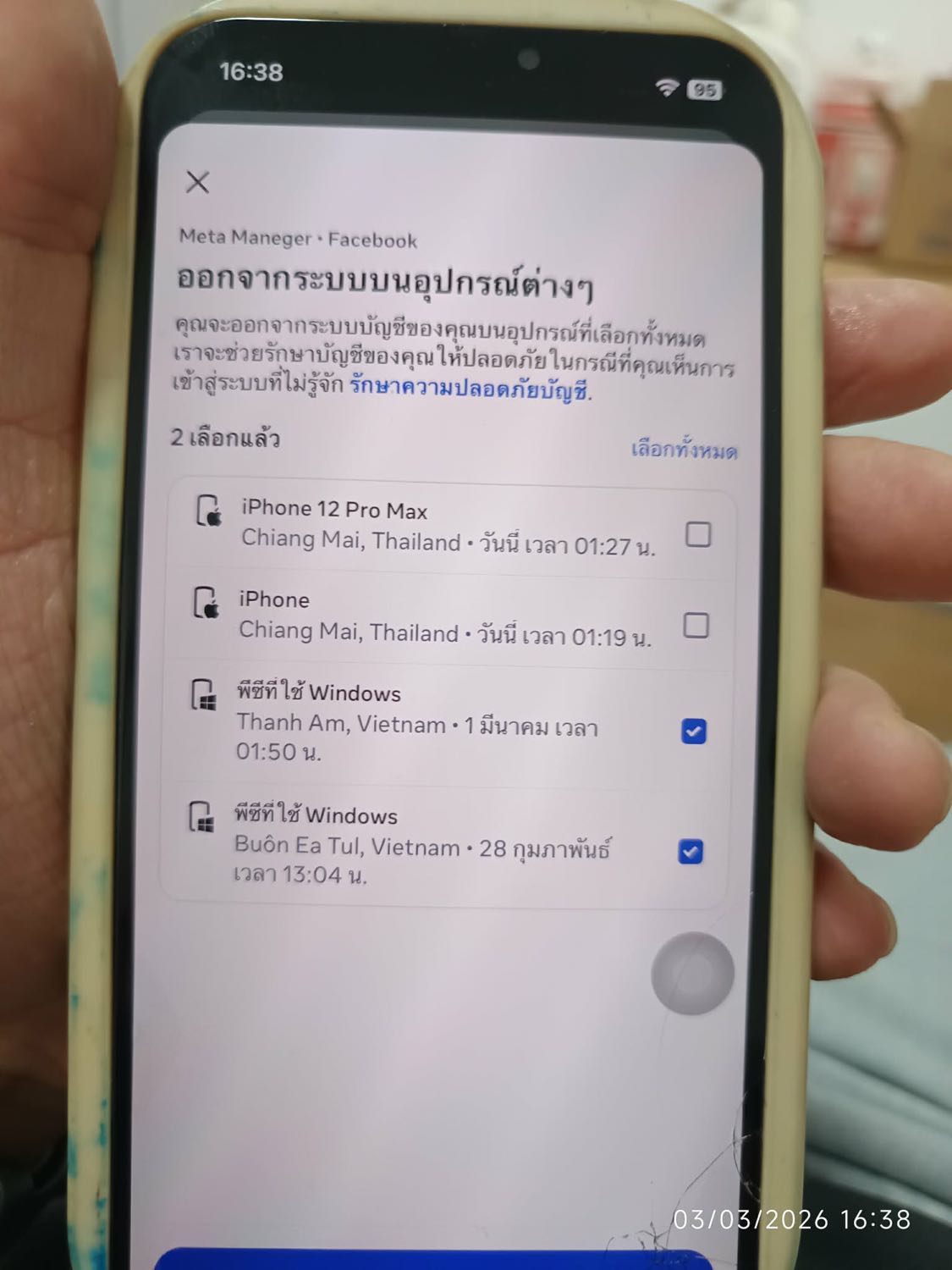 เราทำการออกจากระบบ เฟสบุ๊คทุกที่ ที่ได้เชื่อมต่อ ปกติเราจะlogin เฟสบุ๊คผ่าน โน๊คบุ๊ค โทรศัพท์ไอโฟน แอนดรอย เท่านั้น!!! แต่ มันมีอุปกรณ์อื่นที่เข้ามา แอบใช้ เราก็ลบอุปกรณ์พวกนั้นออก ***ที่อยู่ ของพวกมันอยู่ที่ เวียดนาม ระบบแจ้งเตือนแบบนี้ มันเข้าlogin ผ่าน Window Iphone Android คือมันไม่ใช่รุ่นที่เราใช้ เราลบออกหมด
