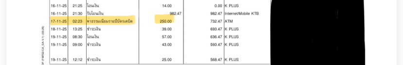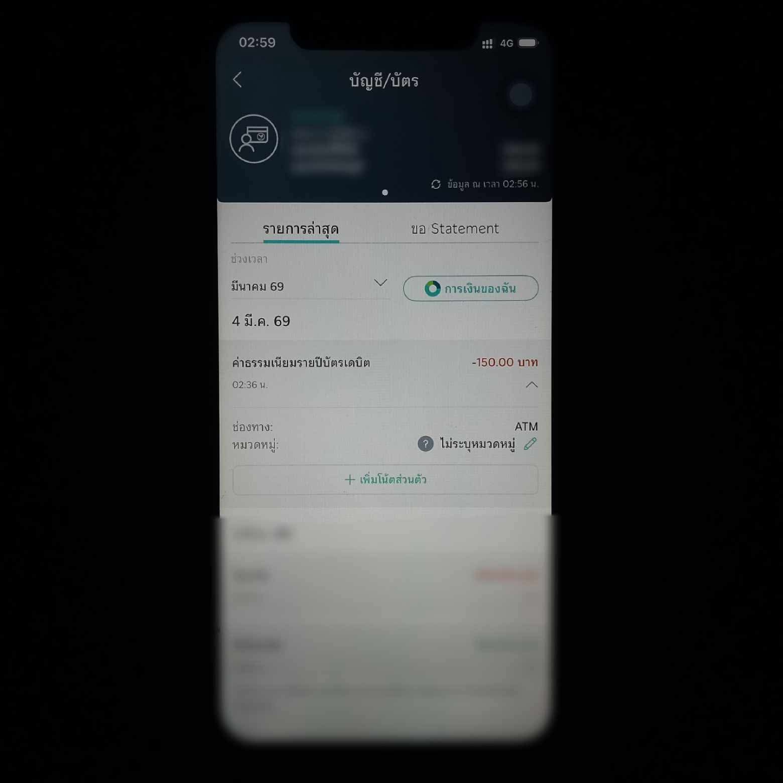 มีการแจ้งเตือนการตัดค่าธรรมเนียมรายปีบัตรเดบิตขึ้นมา เวลา 02:36 น. ของวันที่ 4 มกราคม 2569 หักไป 150 บาท ซึ่งตนเองรู้สึกตกใจมาก เพราะเมื่อไม่นานมานี้หักไปแล้ว 250 บาทในวันที่ 17/11/68 ตามรายการเดินบัญชีเงินฝากออมทรัพย์อิเล็กทรอนิกส์
