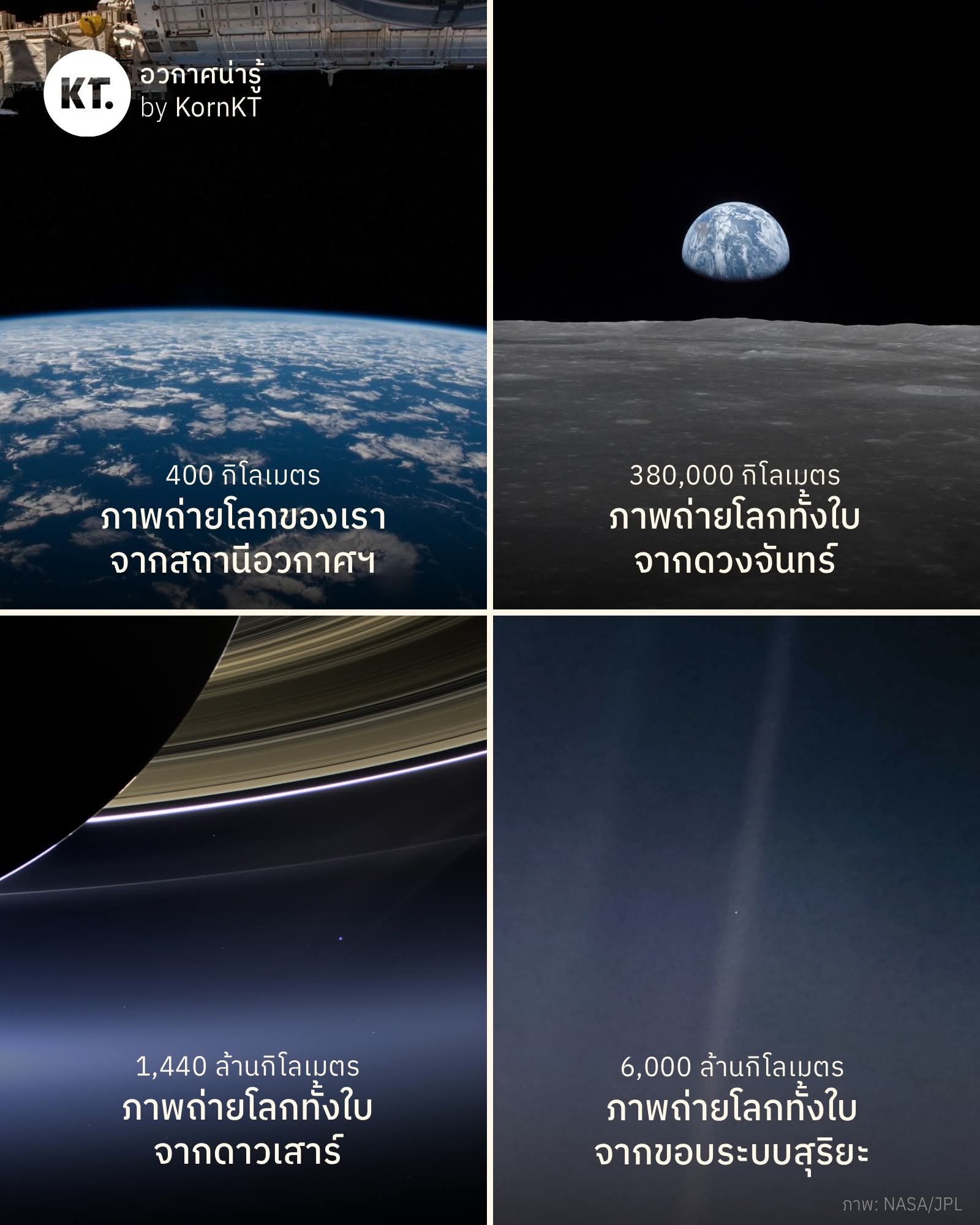 ✨ ภาพถ่าย 'Pale Blue Dot' จากยาน Voyager 1 เมื่อปี 1990 ด้วยระยะห่างประมาณ 6,000 ล้านกิโลเมตรจากโลก ซึ่งเทียบเท่าตำแหน่งวงโคจรดาวพลูโต และเป็นภาพถ่ายโลกจากมุมไกลที่สุด ที่เคยมีการบันทึกไว้ได้
