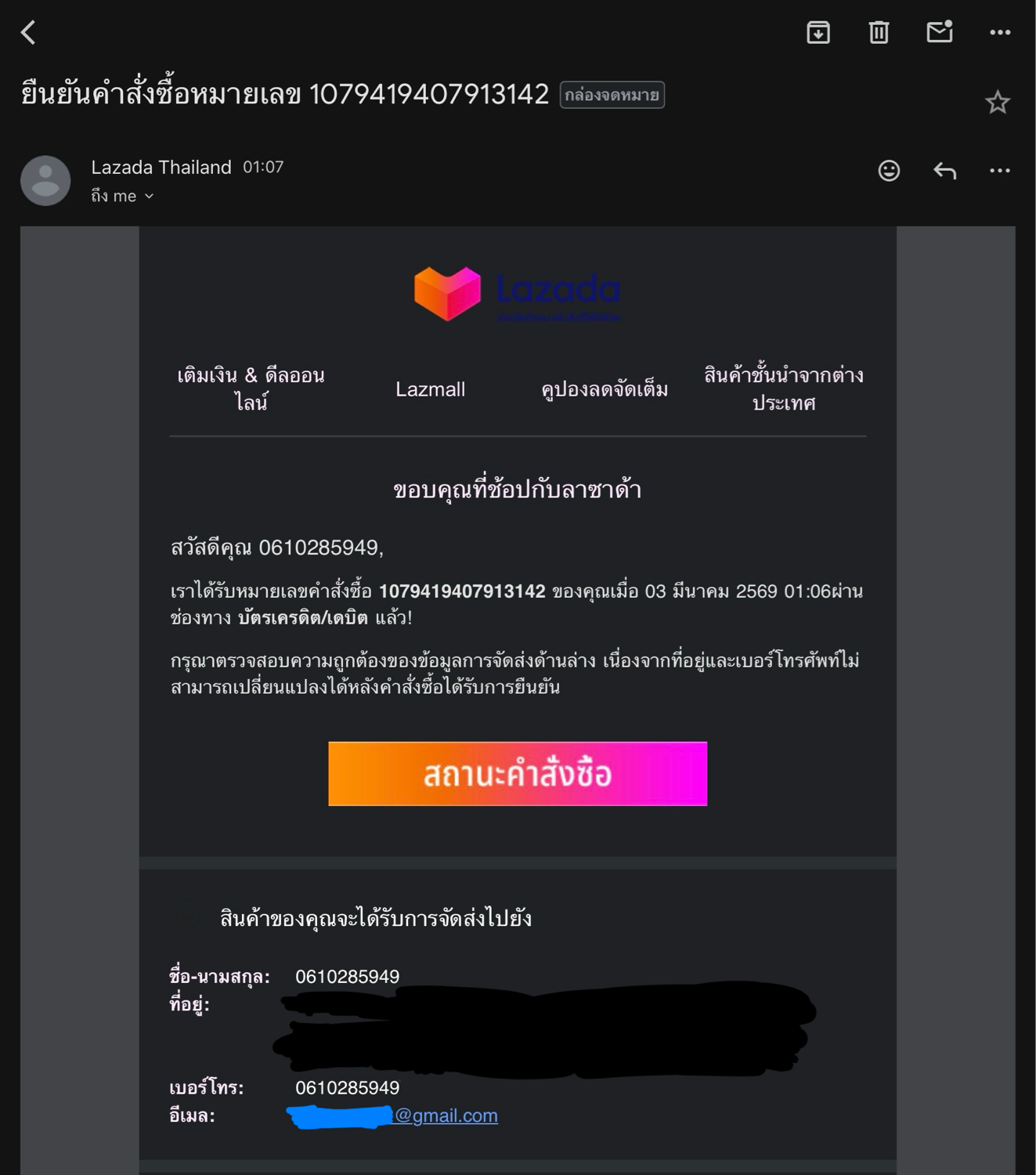 อยู่เฉยๆ ก็ได้รับอีเมลยืนยันการสมัครสมาชิกจาก Lazada และมีการสั่งซื้อสินค้าด้วย ทั้งๆที่เราไม่เคยซื้อของออนไลน์เลยซักครั้งเดียว *** และไม่เคยสมัคร Lazada เลยซักครั้ง *** พอจะติดต่อเจ้าหน้าที่ ก็ไม่