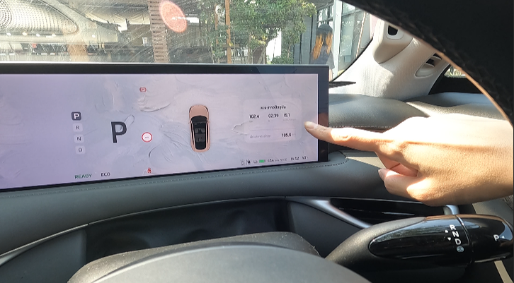 ถอยรถออกจากที่จอด กล้องมองภาพถือว่าใช้ได้นะอยู่ในเกณฑ์ชัดดี คราวนี้ลองเปลี่ยนจากโหมด Eco มาเป็น Comfort สิ่งที่รู้สึกเลย คันเร่งตึงกว่า Eco แตะน้อยกว่ากำลังมาแล้ว ที่สำคัญแอร์เย็นแรงกว่า Eco แต่ใช้โหมด Comfort ได้สักพักก็เปลี่ยนเป็น Eco ดูแล้วคร่าวๆ Comfort น่าจะใช้พลังงานเยอะกว่า