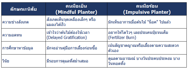 >คนมือเย็น: มักจะมีพฤติกรรม "สังเกตก่อนสาด" คือเช็กความชื้นใต้ดินหรือดูอาการของใบก่อนน้ำจะลงกระถาง