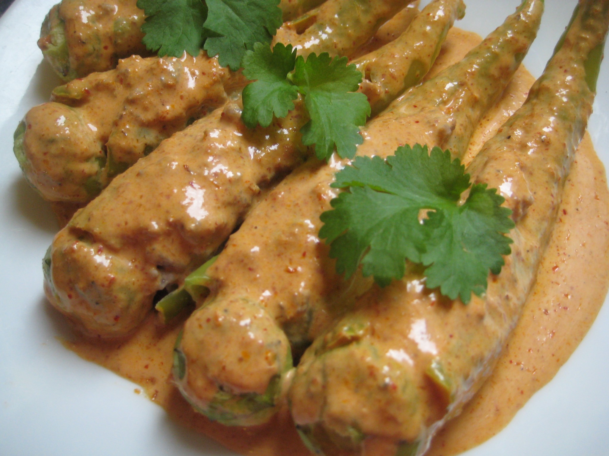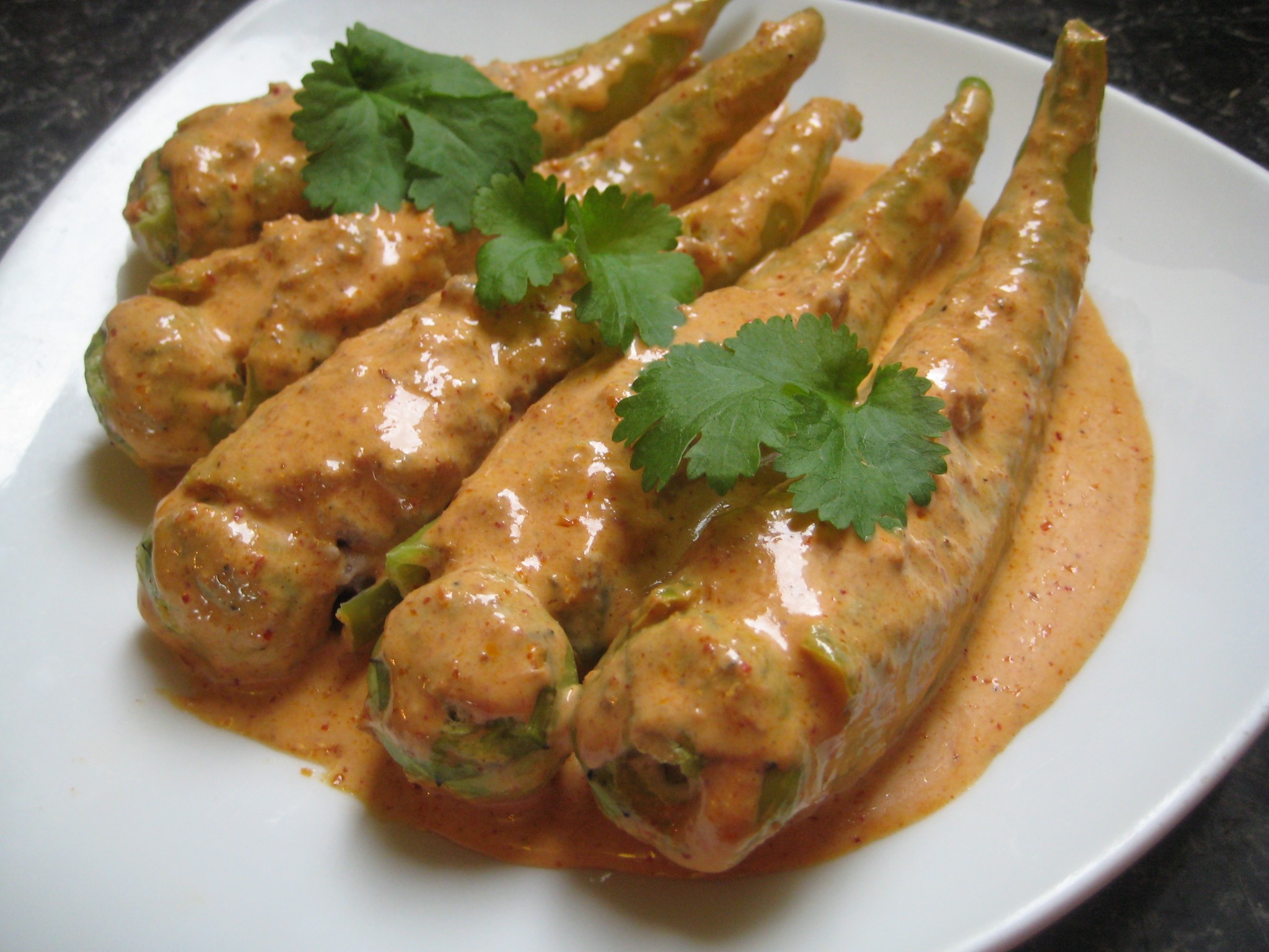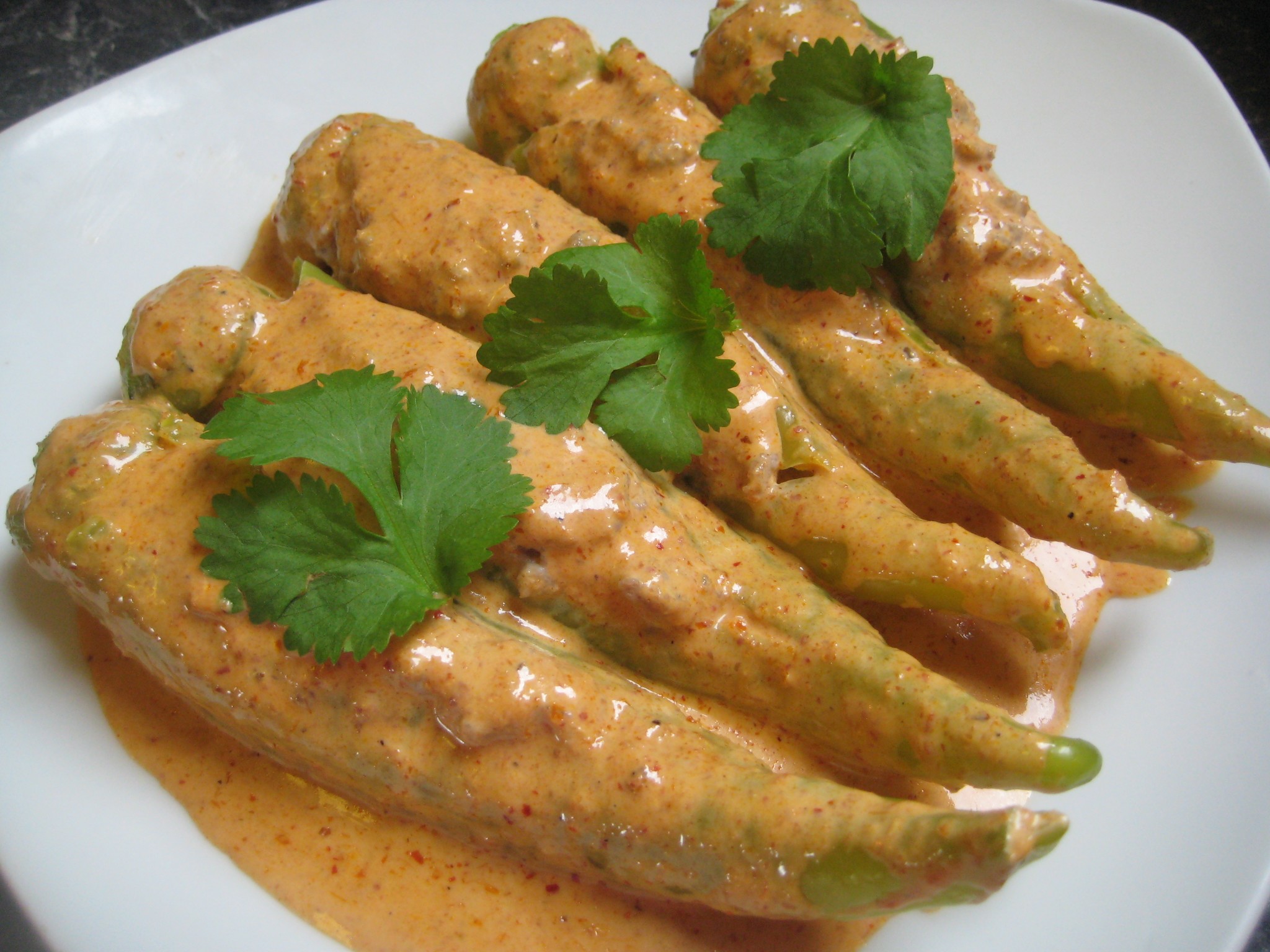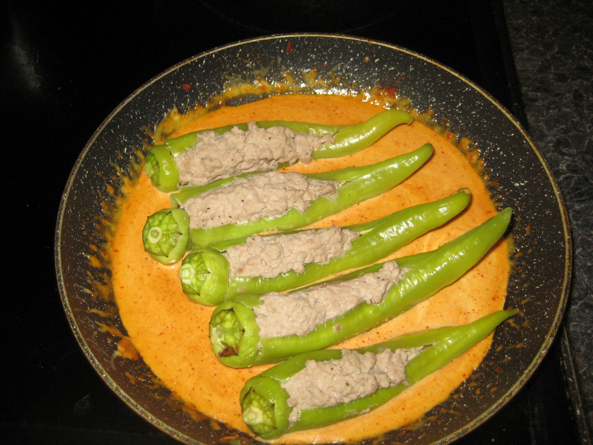 ตั้งกระทะบนไฟกลาง ใส่หัวกะทิ พริกแกงเผ็ด ผัดจนพริกแกงหอม นำพริกหยวกยัดไส้ลงเคี่ยวต่อประมาณ 5 นาทีพอให้น้ำแกงซึมเข้าพริกหยวกและไส้สุกดี ปรุงรสด้วยน้ำตาล น้ำปลา  ชิมรสตามชอบ ปิดไฟ