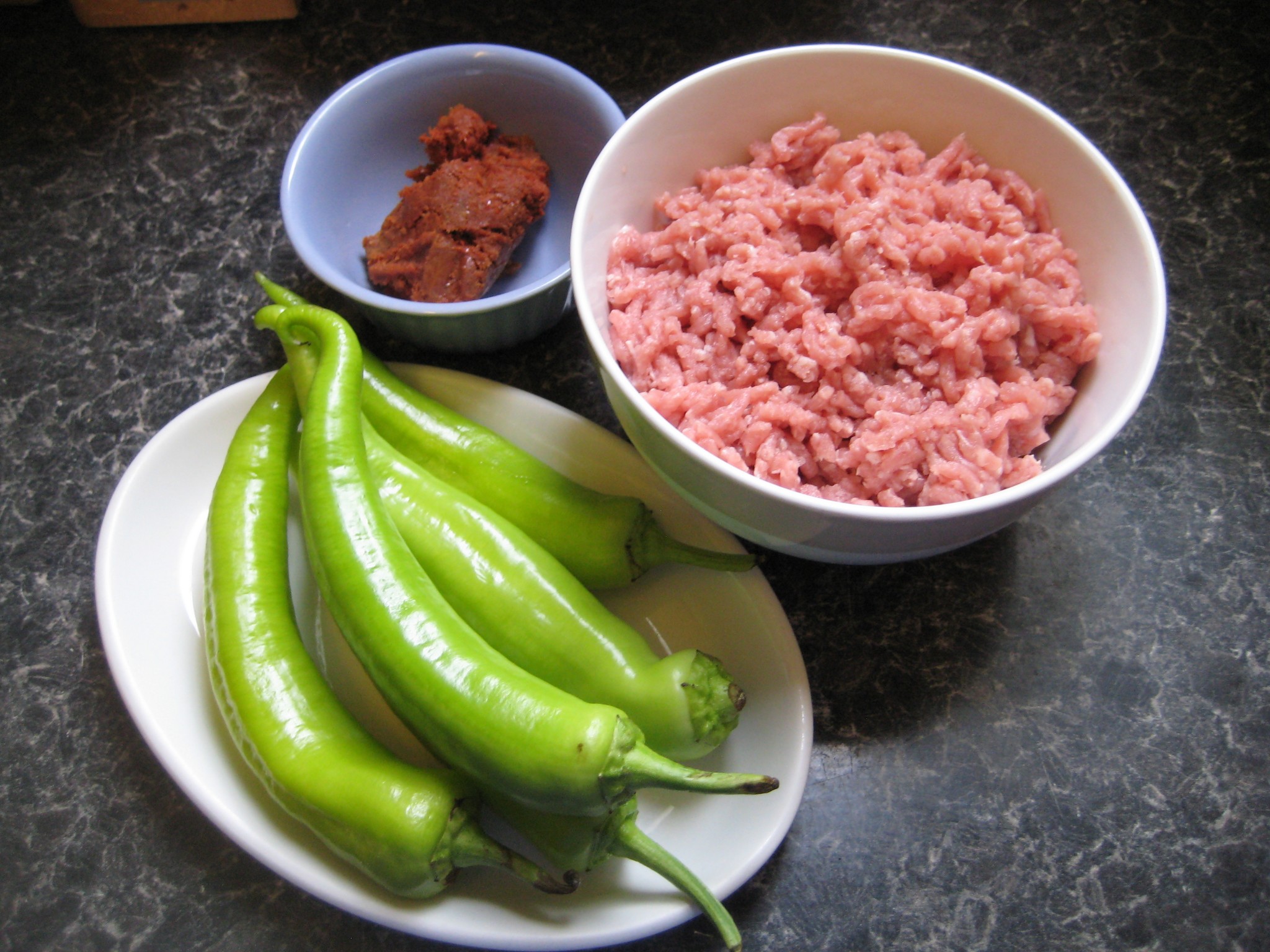 ส่วนผสม หมูสับ กระเทียม รากผักชี พริกไทย เกลือป่น ซอสหอยนางรม พริกหยวก หัวกะทิ พริกแกงเผ็ด น้ำตาล น้ำปลา