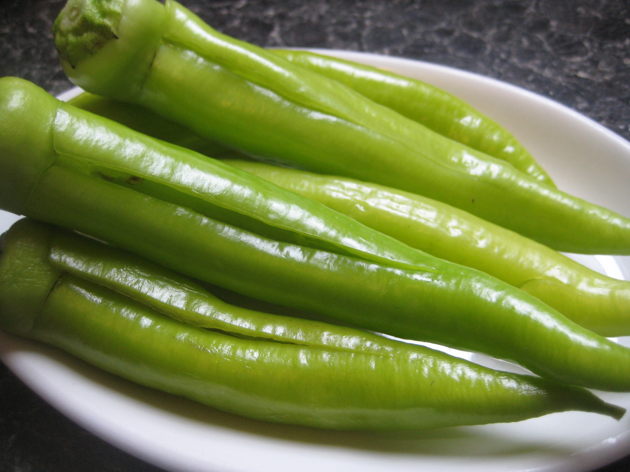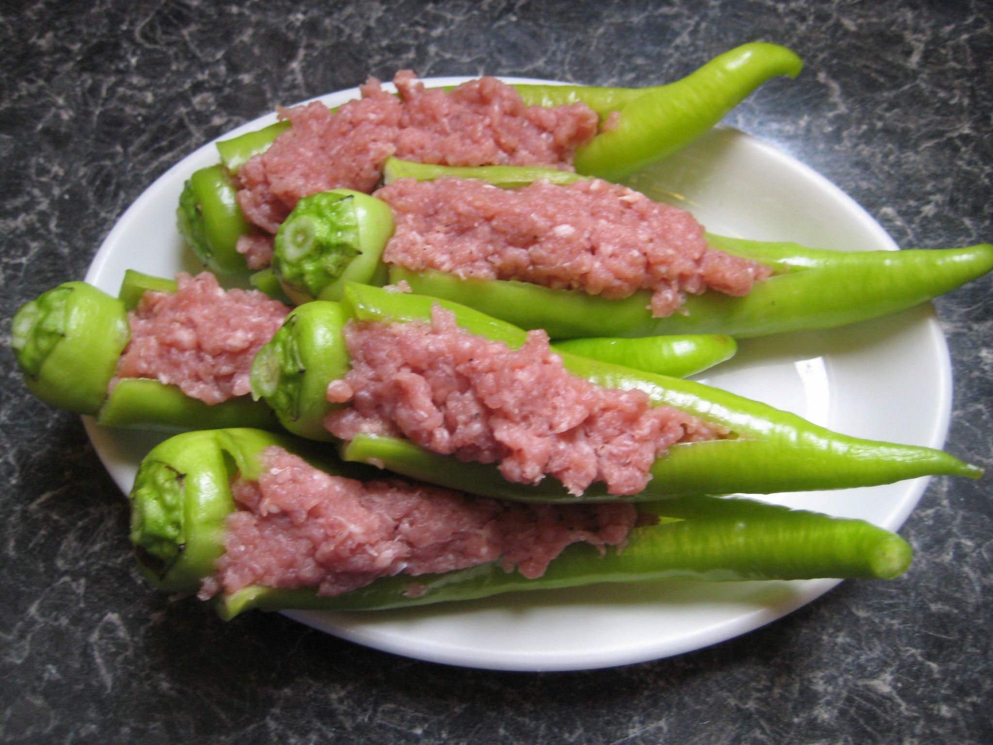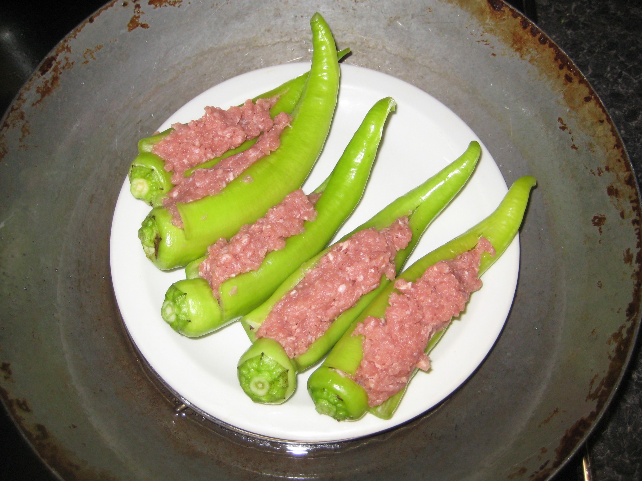 ใช้มีดกรีดพริกหยวกตามแนวยาว เอาไส้พริกหยวกออก ทำจนหมด นำหมูที่หมักไว้ ยัดไส้เข้าไปจนเต็ม จากนั้นนำไปนึ่งประมาณ 5 นาที นำลงจากเตาพักไว้