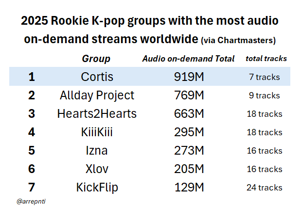 ภายในระยะเวลาประมาณเพียง 4 เดือน อัลบั้มเดบิวต์ “Color Outside the lLines” ของ Cortis ก็กลายเป็นอัลบั้มที่มียอดสตรีมมากที่สุดในปี 2025 ของ KPOP รุ่นที่ 5 ด้วยยอ