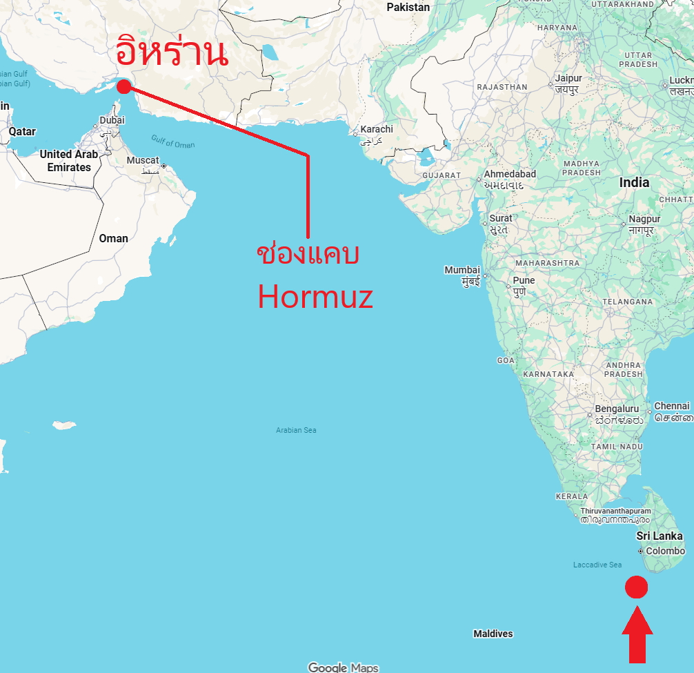 จุดเกิดเหตุอยู่ห่างจากเมือง Galle ทางใต้ของศรีลังกาประมาณ 80 กิโลเมตร ตามลูกศรสีแดงในภาพครับ และจุดที่เกิดเหตุอยู่ห่างจากช่องแคบ Hormuz มากถึง 3,200 กิโลเมตร