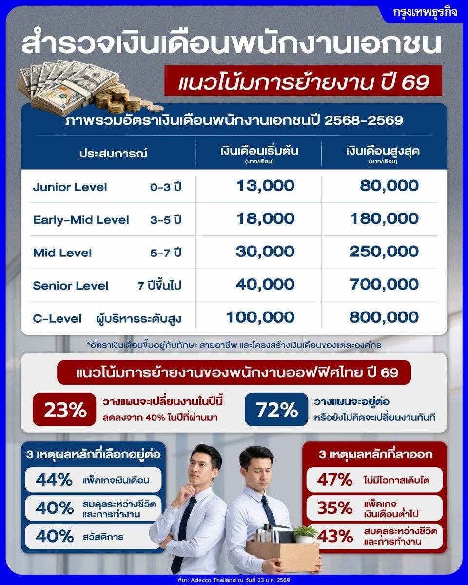 ภายใต้บริบทของเศรษฐกิจที่เติบโตอย่างจำกัด การเร่งปรับใช้เทคโนโลยีดิจิทัล โครงสร้างประชากรที่เปลี่ยนแปลง และความคาดหวังของแรงงานที่ซับซ้อนขึ้นในปัจจุบัน ส่งผลให้ตลาดแรงงานเปลี่ยนแปลงไปตามเดิม "อเด็คโก้ประเทศไทย" เผยแพร่คู่มืออัตราเงินเดือนพนักงานเอกชนประจำปี 2569 หรือ Adecco Thailand Salary Guide 2026 รายงานที่รวบรวมอัตราเงินเดือนครอบคลุมตำแหน่งสำคัญในกลุ่มงานหลากหลาย