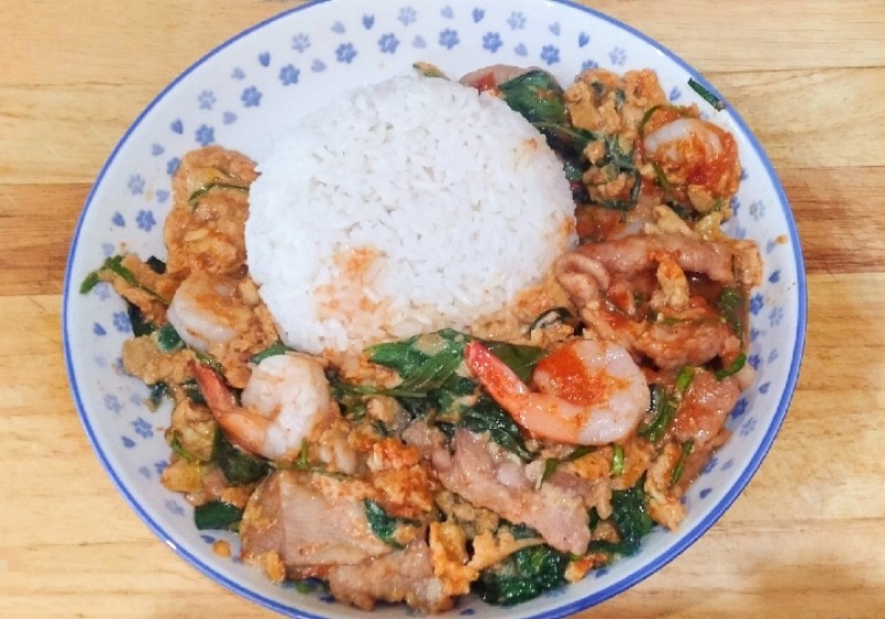 3. ตั้งกระทะไฟอ่อน นำกุ้งกับหมูลงไปผัด
