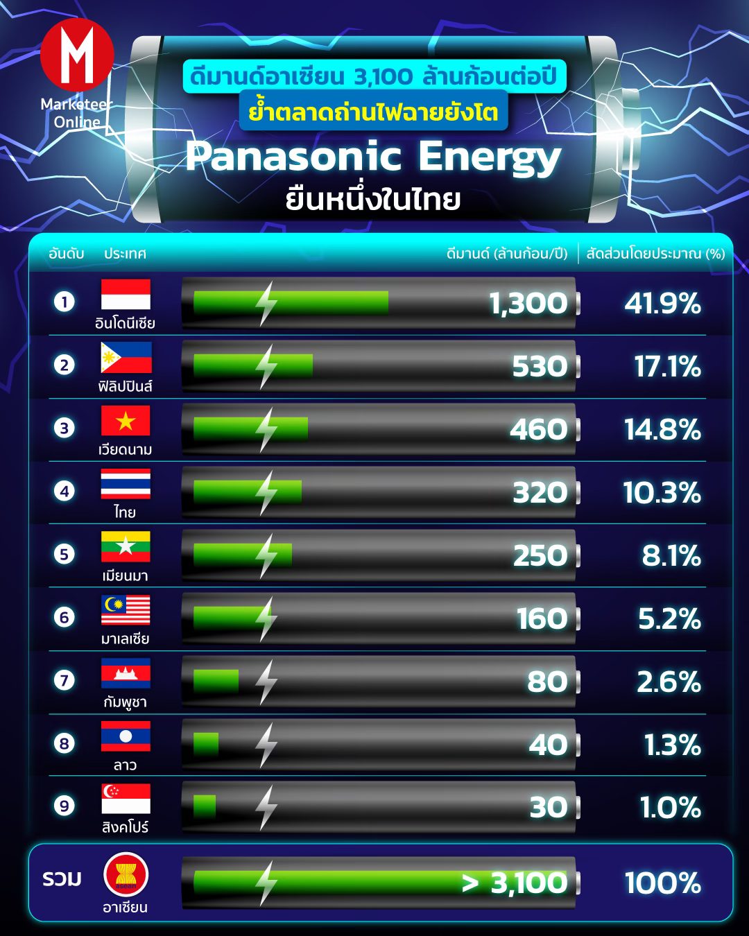 ตลาดถ่านไฟฉายอาจไม่ได้ถูกพูดถึงบ่อยเท่ากลุ่มแบตเตอรี่สำหรับยานยนต์ไฟฟ้า แต่ตัวเลขในภูมิภาคอาเซียนกำลังสะท้อนอีกภาพหนึ่ง เมื่อดีมานด์รวมอยู่ที่มากกว่า 3,100 ล้านก้อนต่อปี ขณะที่ประเทศไทยมีขนาดตลาดราว 320 ล้านก้อนต่อปี และอยู่อันดับ 4 ของภูมิภาค รองจากอินโดนีเซีย ฟิลิปปินส์ และเวียดนาม