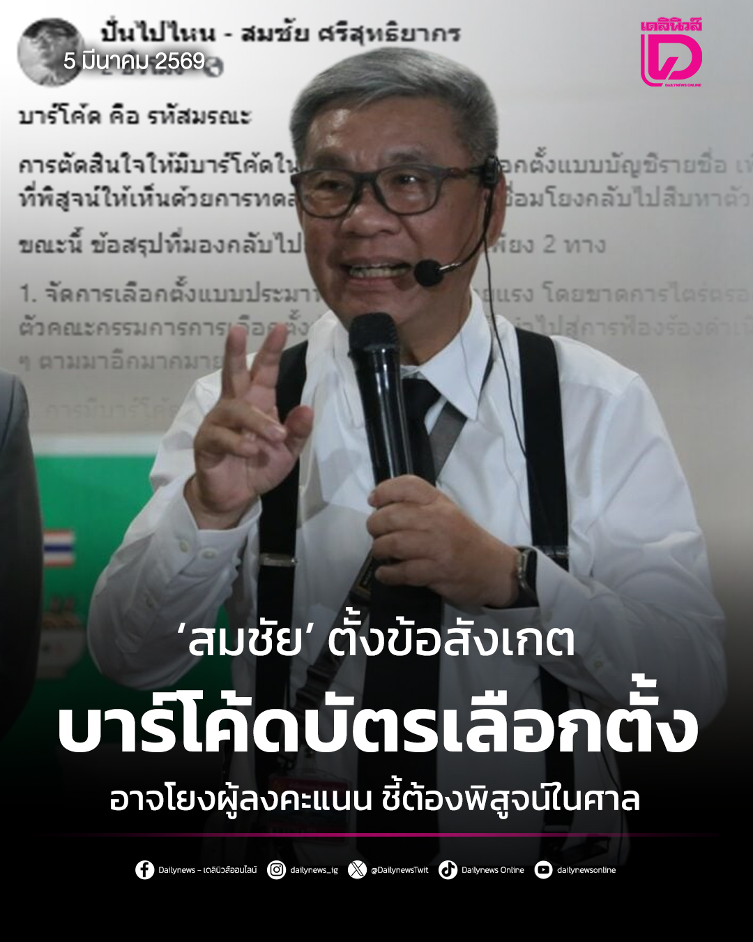 เมื่อวันที่ 5 มี.ค. 69 ผู้สื่อข่าวรายงานว่า “นายสมชัย ศรีสุทธิยากร” อดีตกรรมการการเลือกตั้ง (กกต.) ได้ออกมาโพสต์ข้อความวิเคราะห์เกี่ยวกับการติดบาร์โค้ดที่ด้านล่างของบัตรเลือกตั้งแบบบัญชีรายชื่อลงแฟนเพจ “ปั่นไปไหน – สมชัย ศรีสุทธิยากร” เผยว่าการใช้บาร์โค้ดลักษณะดังกล่าว ซึ่งเพิ่งมีในการเลือกตั้งปี 2569 อาจทำให้สามารถเชื่อมโยงย้อนกลับไปถึงผู้ลงคะแนนได้