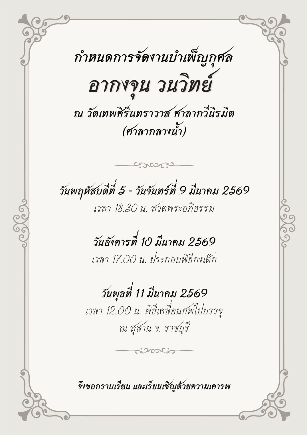 วันพุธที่ 11 มีนาคม 2569 - เวลา 12.00 น. พิธีเคลื่อนศพไปบรรจุ ณ สุสาน จ.ราชบุรี