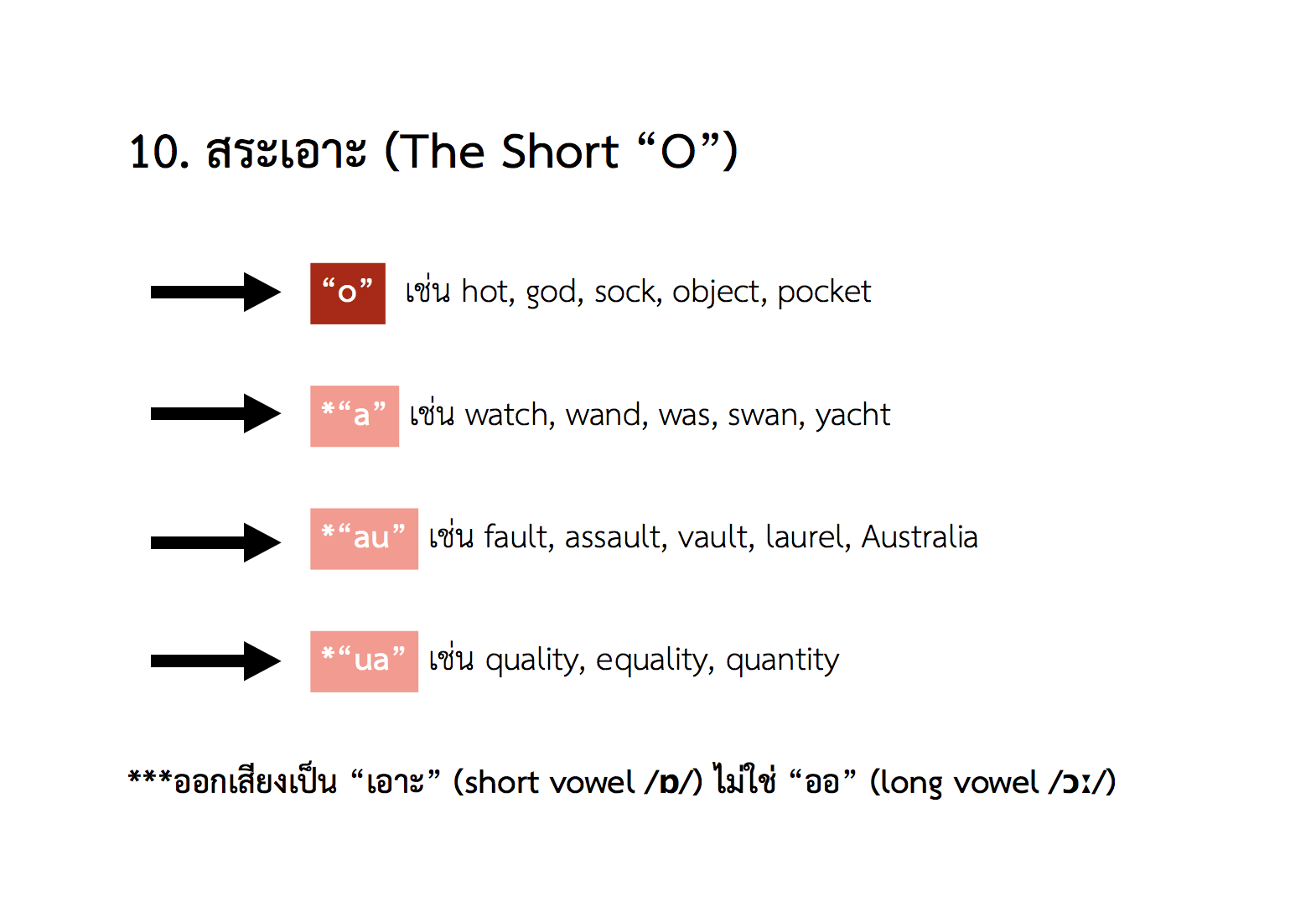 10. สระเอาะ (The Short O) สะกดได้ 4 แบบคือ -o, -a, -au, -ua