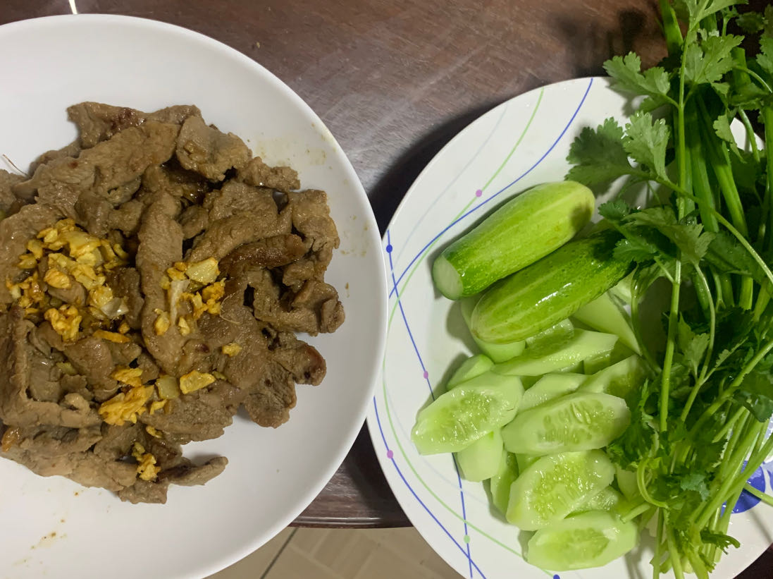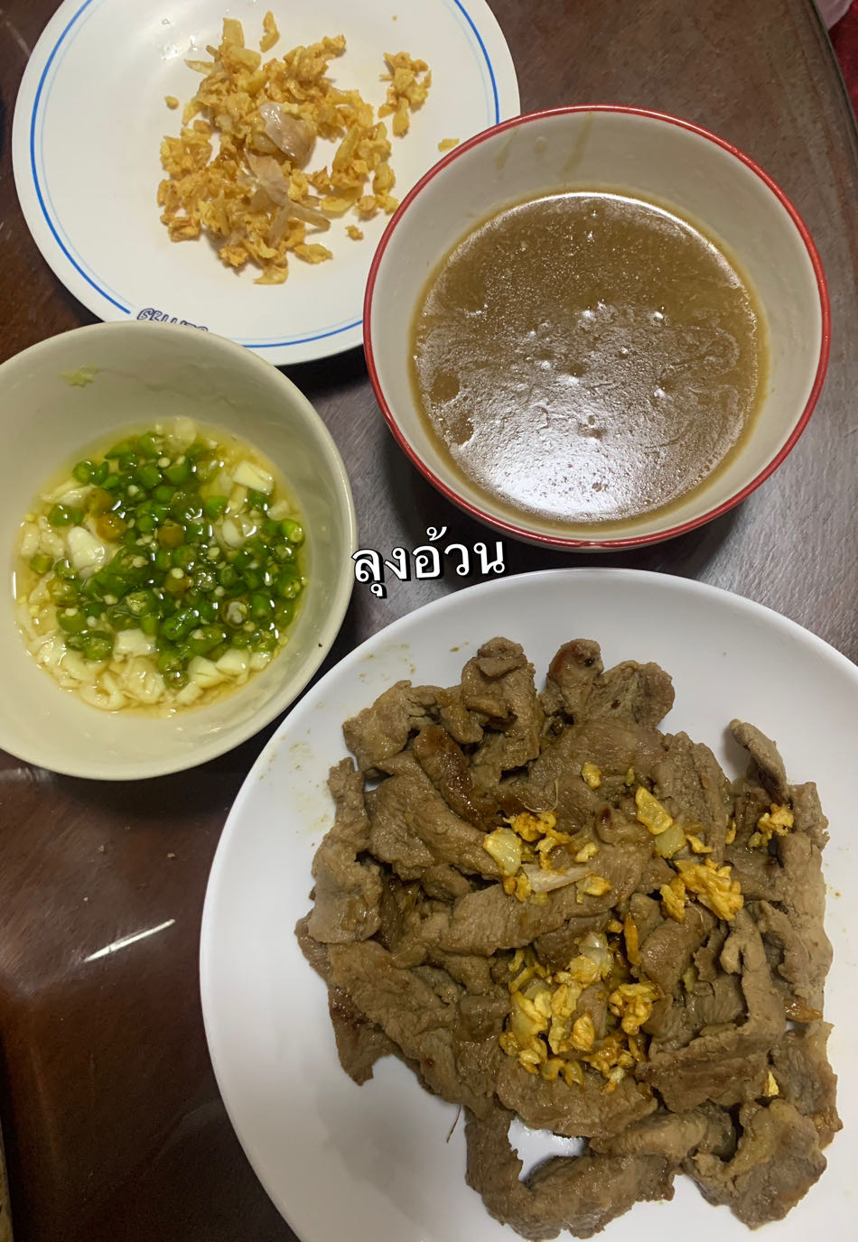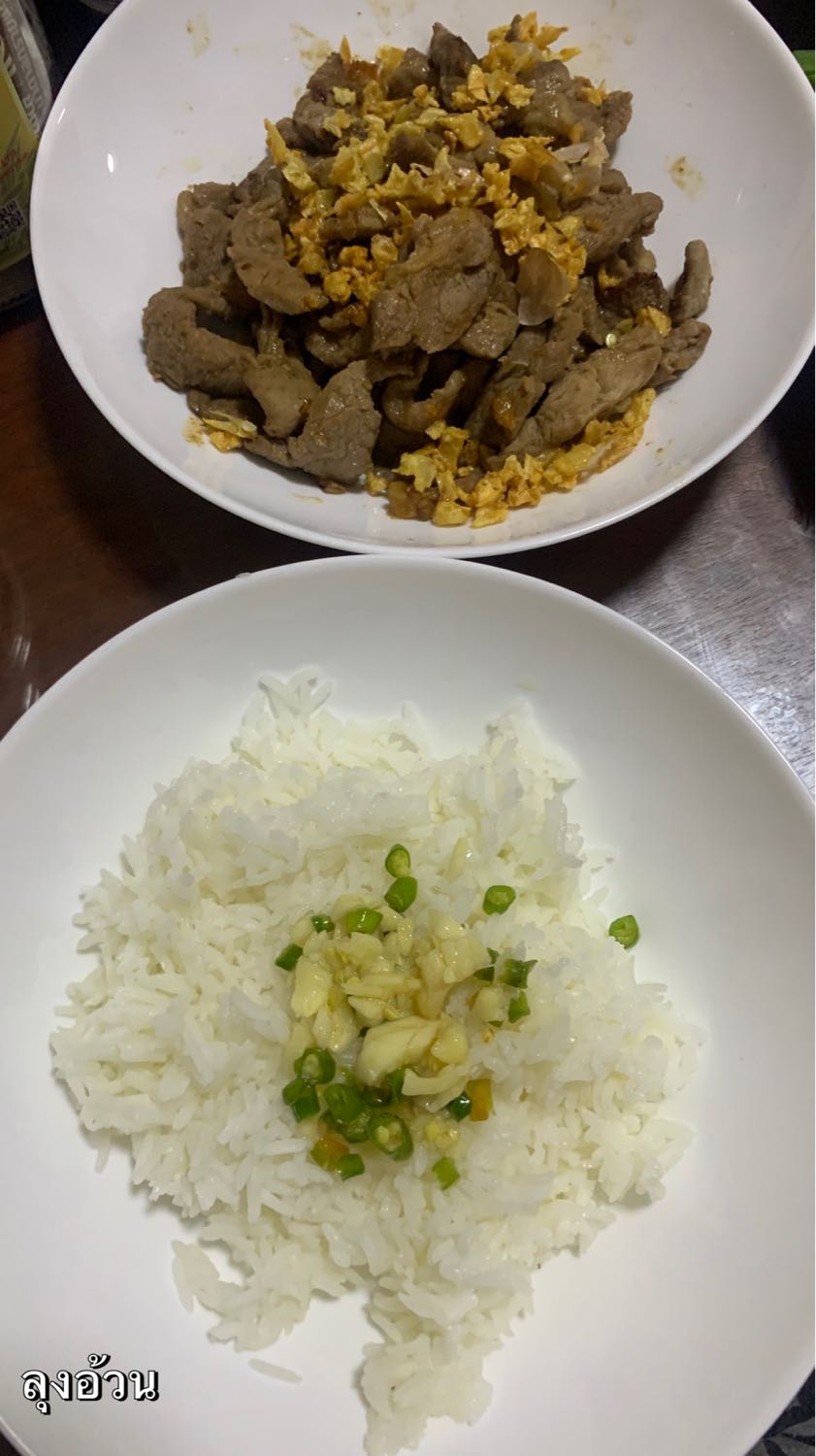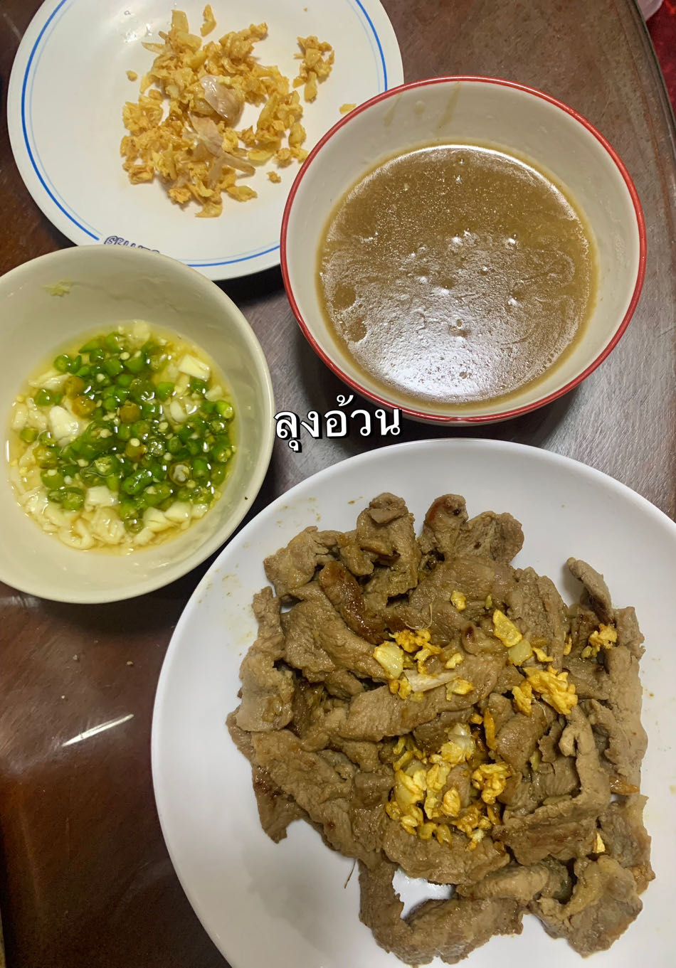 กระเทียม: มักใช้กระเทียมเจียวโรยหน้า หรือทอดกระเทียมจนกรอบแยกไว้ แล้วนำมาคลุกกับหมูทอดในตอนท้าย