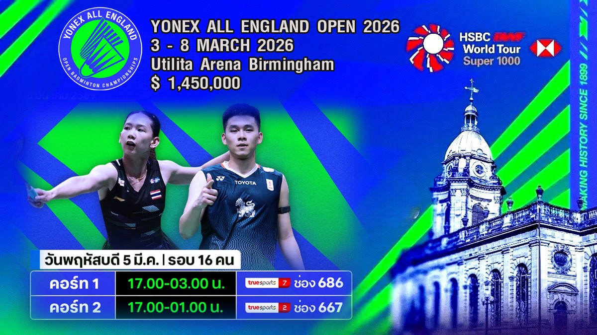 เชียร์สด ! แบดมินตัน YONEX AllEnglandOpen Badminton Championships 2026 : รอบ 16 คน (5 มี.ค.69) (คู่แรก 17.00 น.)