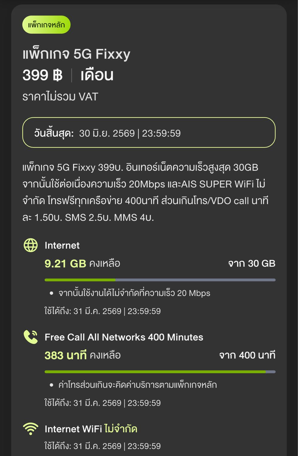 ปัจจุบันใช้งานแพ็คเกจ 5G Fixxy 399 ของค่ายนึงอยู่ โปรเน็ต 70 GB แต่เราใช้เยอะมาก ยังไม่หมดเดือนเลยเน็ตหมดก่อน คือโปรนี้ถ้าใช้หมด จะติด Fup เหลือความเร็วแค่ 1Mbp