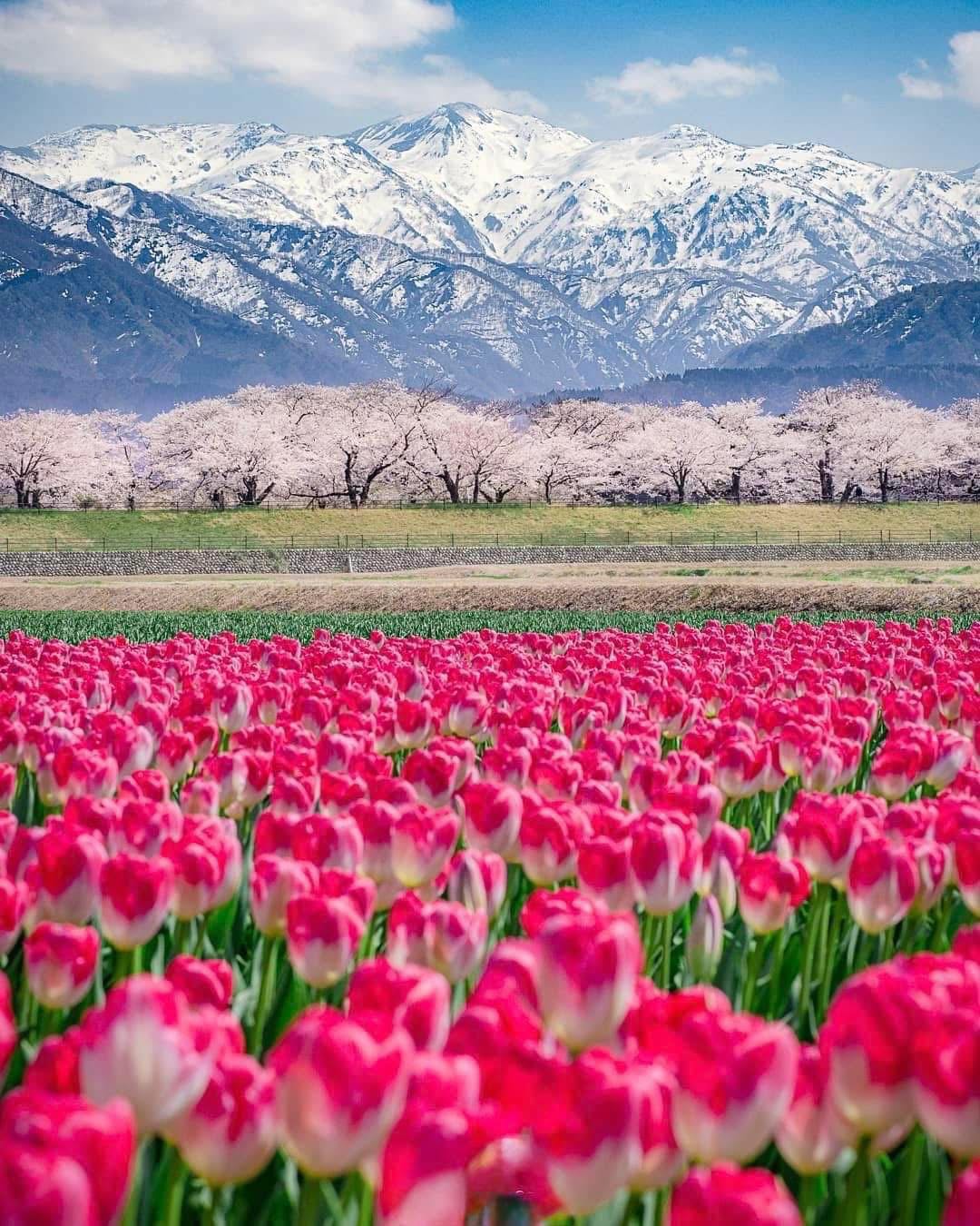 🌸✨หนึ่งปีมีครั้งเดียว! ซากุระ ทิวลิป และเทือกเขาหิมะในเฟรมเดียวที่จังหวัดโทยามะ ภูมิภาคโชบุ ญี่ปุ่น🏞️🏔️🗻