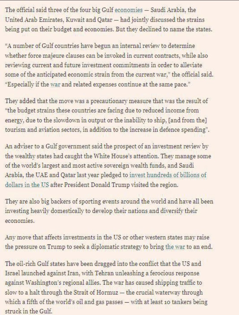 ซาอุดีอาระเบีย สหรัฐอาหรับเอมิเรตส์ คูเวต และกาตาร์ กำลังหารือเกี่ยวกับการถอนตัวจากสัญญาต่างๆ กับสหรัฐฯ และยกเลิกข้อผูกพันการลงทุนในอนาคตในสหรัฐฯ เพื่อบรรเทาความตึงเครียดทางเศรษฐกิจที่เกิดจากสงครามกับอิหร่าน