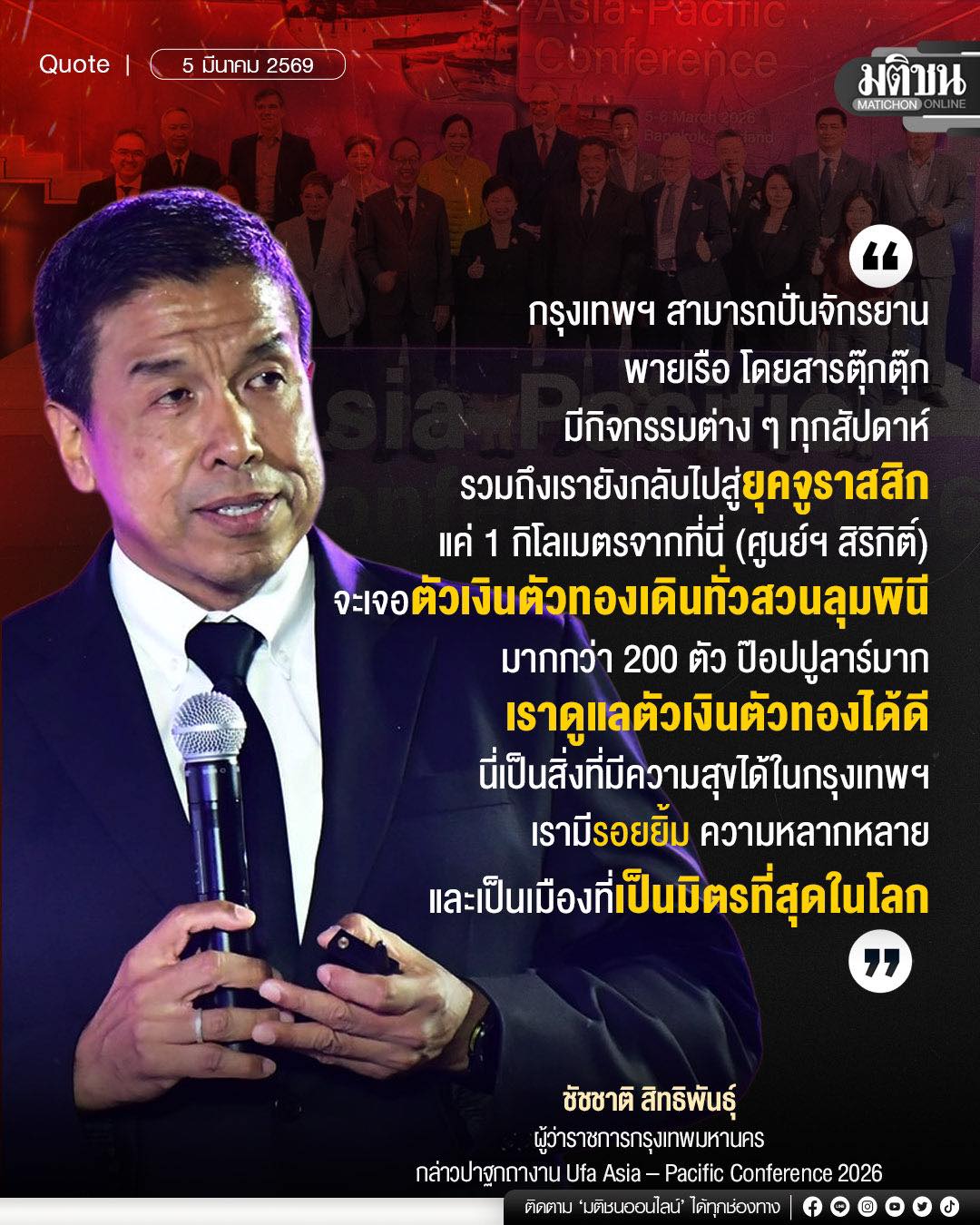 เมื่อวันที่ 5 มีนาคม ที่ศูนย์การประชุมแห่งชาติสิริกิติ์ เขตคลองเตย นายชัชชาติ สิทธิพันธุ์ ผู้ว่าราชการกรุงเทพมหานคร เป็นวิทยากรปาฐกถาพิเศษ (Keynote Speaker) หัวข้อ “Bangkok A City for World – Class Exhibitions” ในงาน Ufa Asia – Pacific Conference 2026