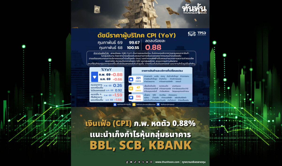 เงินเฟ้อ (CPI) ก.พ. หดตัว 0.88% แนะนำเก็งกำไรหุ้นกลุ่มธนาคาร BBL, SCB, KBANK