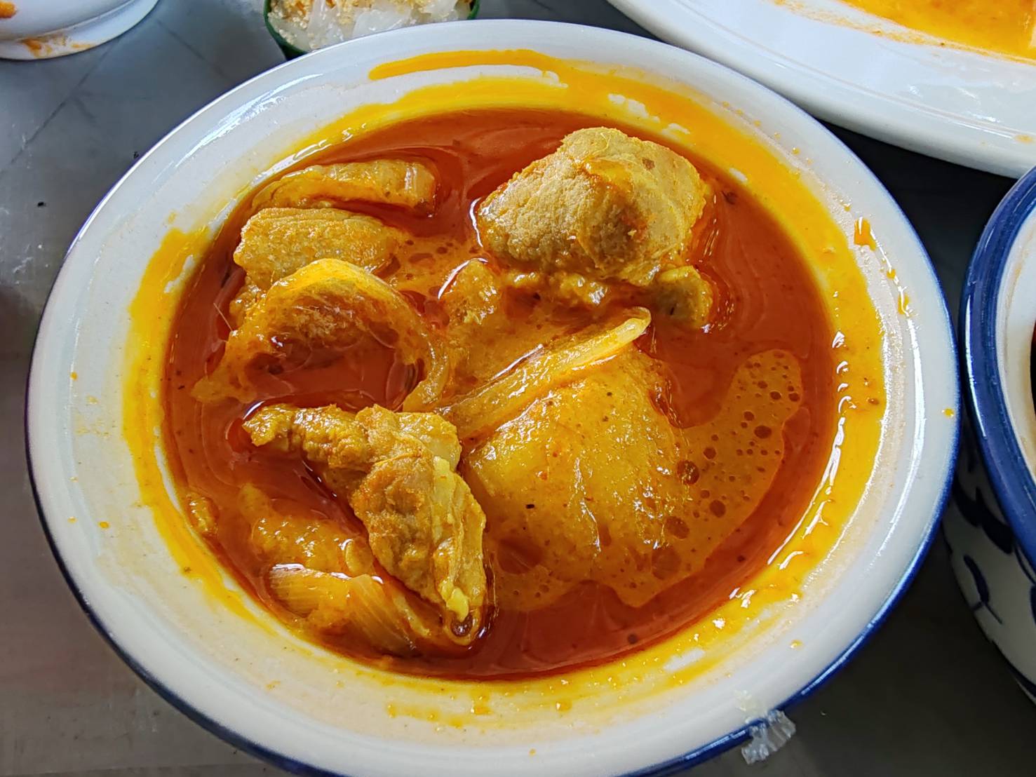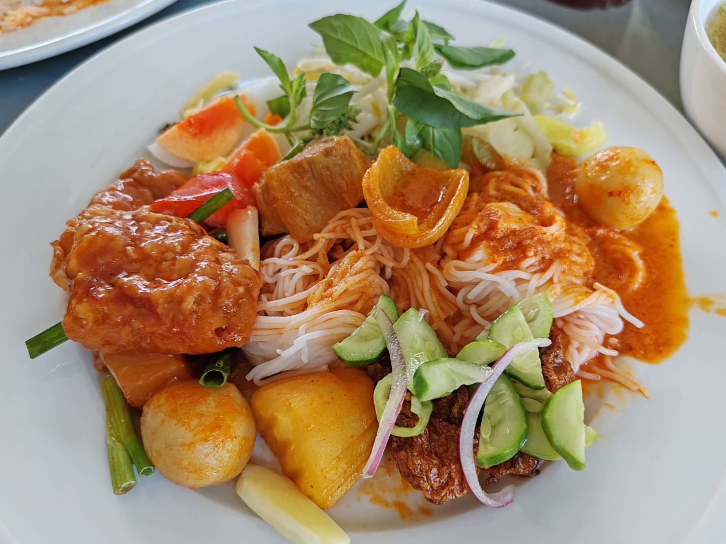 ทำบุญเลี้ยงพระเสร็จก็ได้เวลา รับประทานอาหารเช้า ครับ ขนมจีนน้ำยา ปลาทอดราดซอส