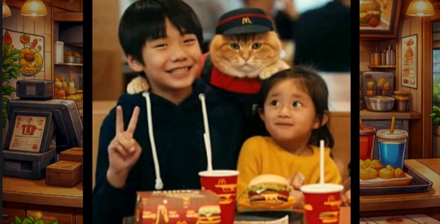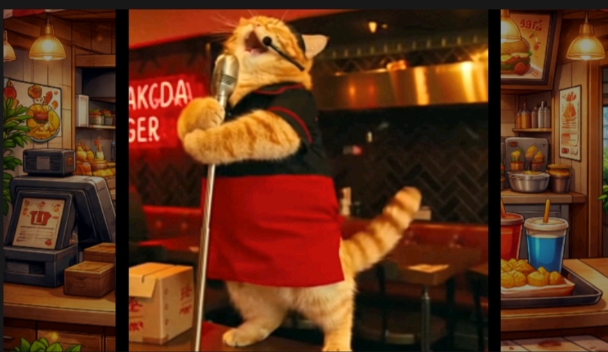 สุดท้ายหลังร้านปิด แมวส้มก็นั่งกินเบอร์เกอร์ที่เหลืออย่างมีความสุข พร้อมคิดในใจว่า