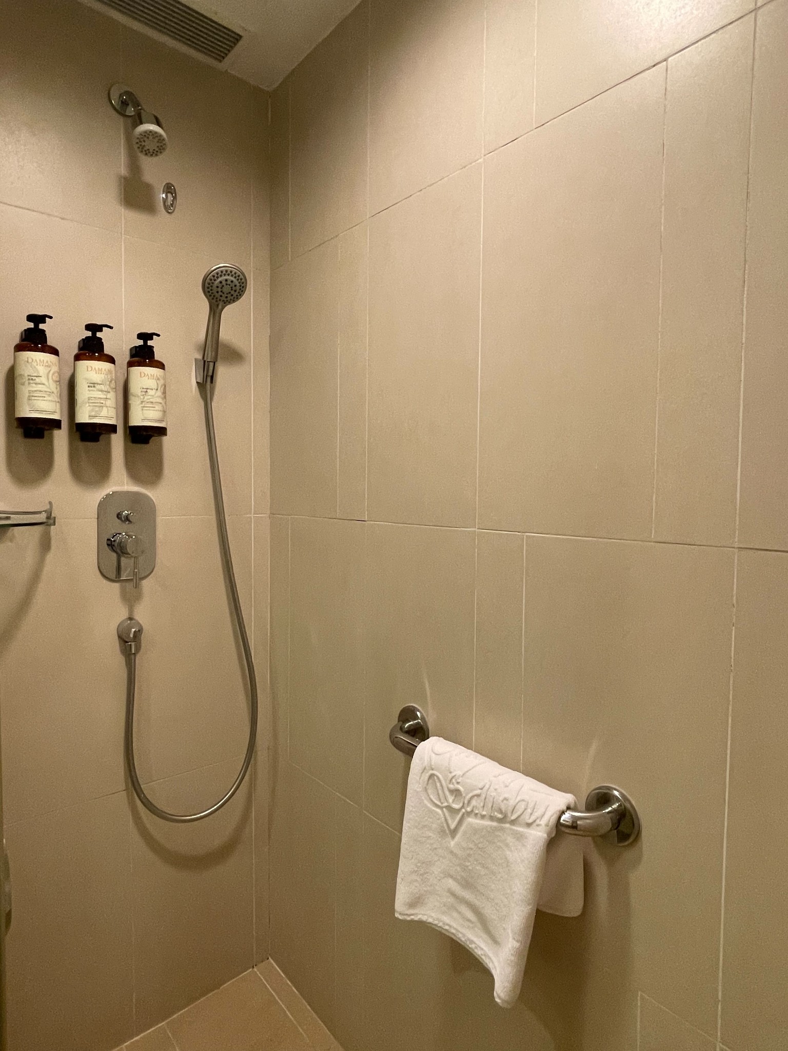 ห้องน้ำแบ่งโซนเปียกแห้ง มีผ้าขนหนูให้คนละ 3 ผืน ไม่มีสายฉีดชำระ