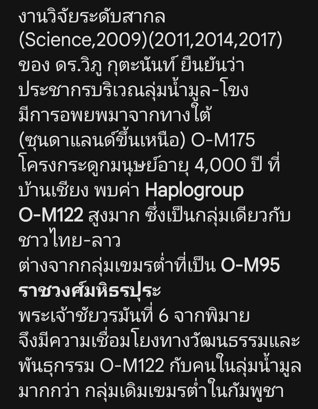 อ้างอิงจากโครงการ HUGO Pan-Asian SNP Consortium (2009) ที่ตีพิมพ์ในวารสาร Science ระบุชัดเจนว่าประชากรในเอเชียตะวันออกและอุษาคเนย์มีจุดกำเนิดร่วมกันจากทางตอนใต้ (South-to-North Migration) โดยรหัส O-M175 คือสายเลือดหลักที่ยืนยันว่าคนในภูมิภาคนี้คือ "ผู้อยู่มาก่อน" ไม่ใช่กลุ่มคนที่เพิ่งอพยพมาจากตอนกลางของทวีปเอเชียตามทฤษฎีเก่า