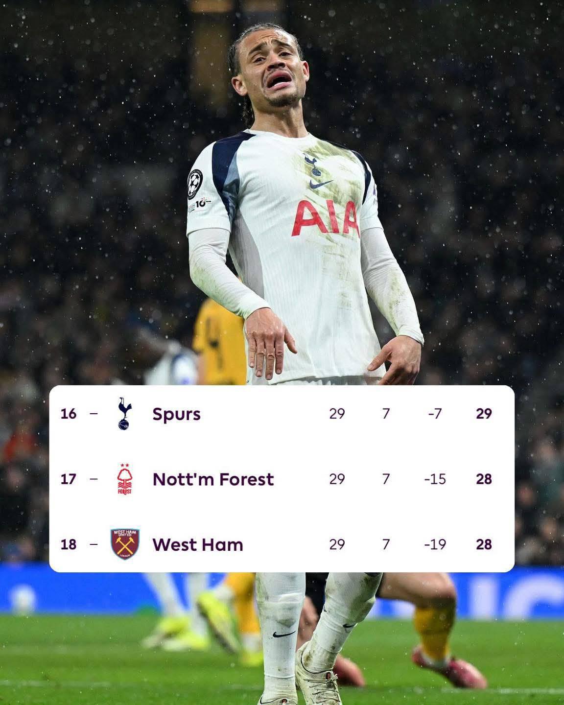 ถ้าให้มองสถานการณ์ตอนนี้ก็ต้องพูดตามตรงเลยว่า โอกาสอยู่รอดในพรีเมียร์ลีกของสเปอร์สมันค่อนข้างสุ่มเสี่ยงอย่างมาก เนื่องจากผลงานที่มีแต่ทรงกับทรุด ขณะที่ทีมหนีตายด้วยกันทั้ง น็อตติงแฮม ฟอเรสต์ และ เวสต์แฮม ต่างเก็บคะแนนในนัดล่าสุดได้ทั้งคู่ก็ยิ่งสร้างความกดดันให้กับพวกเขายิ่งนัก