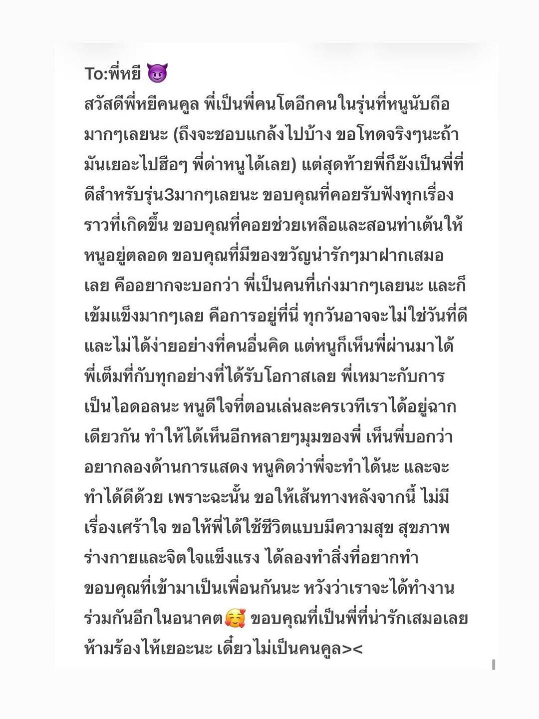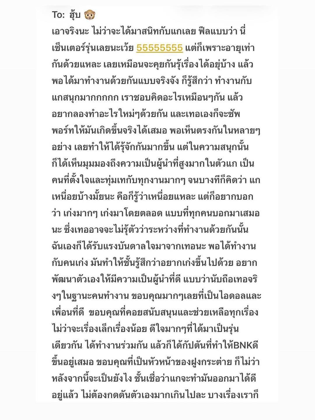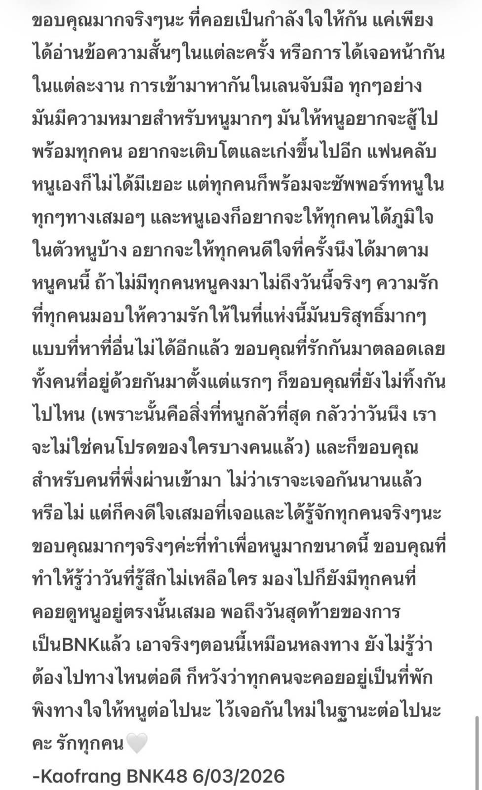 KaofrangBNK48 “...ขอบคุณที่เห็นถึงความพยายามกันมาตลอดเลยนะคะ นี่เองก็เป็นครั้งแรกสำหรับหนูเหมือนกันในการเป็นไอดอล แถมต้องเรียนไปทำงานไป เอาจริงๆ มันหนักมากเลย ทั้งร่างกายและจิตใจ หนูต้องเสียสละ
