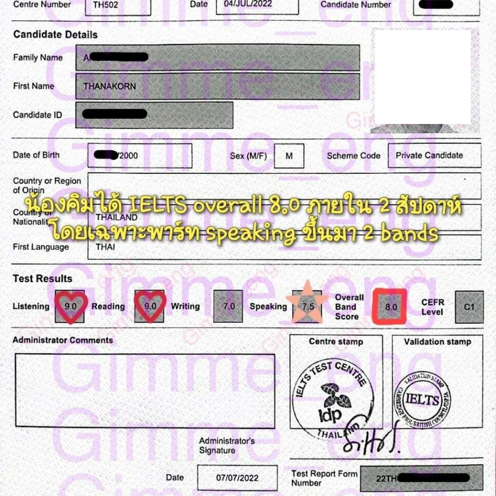 จริง ๆ สิ่งที่น่าสนใจคือ Speaking เพราะก่อนหน้านี้ลองทำ Mock test เล่น ๆ เคยได้ประมาณ 5.5 เท่านั้น แต่พอไปสอบจริงได้ 7.5 ถือว่าขึ้นมาเยอะพอสมควร ภายในเวลาประมาณ 2 สัปดาห์