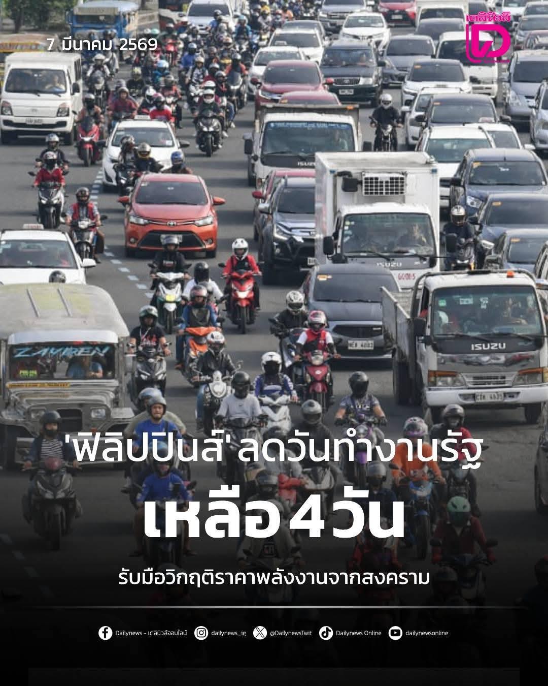 ผู้นำฟิลิปปินส์สั่งปรับระบบทำงานหน่วยงานรัฐทั่วประเทศ เหลือสัปดาห์ละ 4 วัน พร้อมมาตรการประหยัดพลังงานและลดกิจกรรมที่ไม่จำเป็น หลังการปิดช่องแคบฮอร์มุซจากสงครามสหรัฐ–อิหร่าน ดันราคาน้ำมันโลกพุ่ง เสี่ยงกระทบเศรษฐกิจของปรเทศ