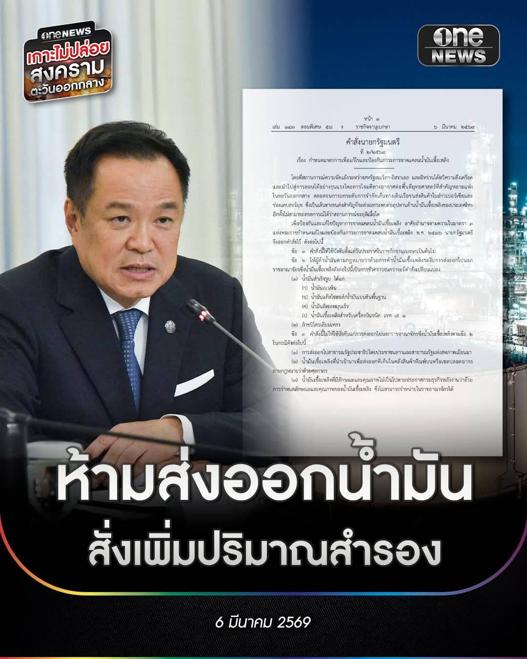 ”อนุทิน“ ลงนามคำสั่งนายกฯ ระงับการส่งออกน้ำมันไปนอกราชอาณาจักรชั่วคราว พร้อมสั่งให้ผู้ค้าสำรองน้ำมันเพิ่ม เพื่อรับมือสถานการณ์การสู้รบในตะวันออกกลาง