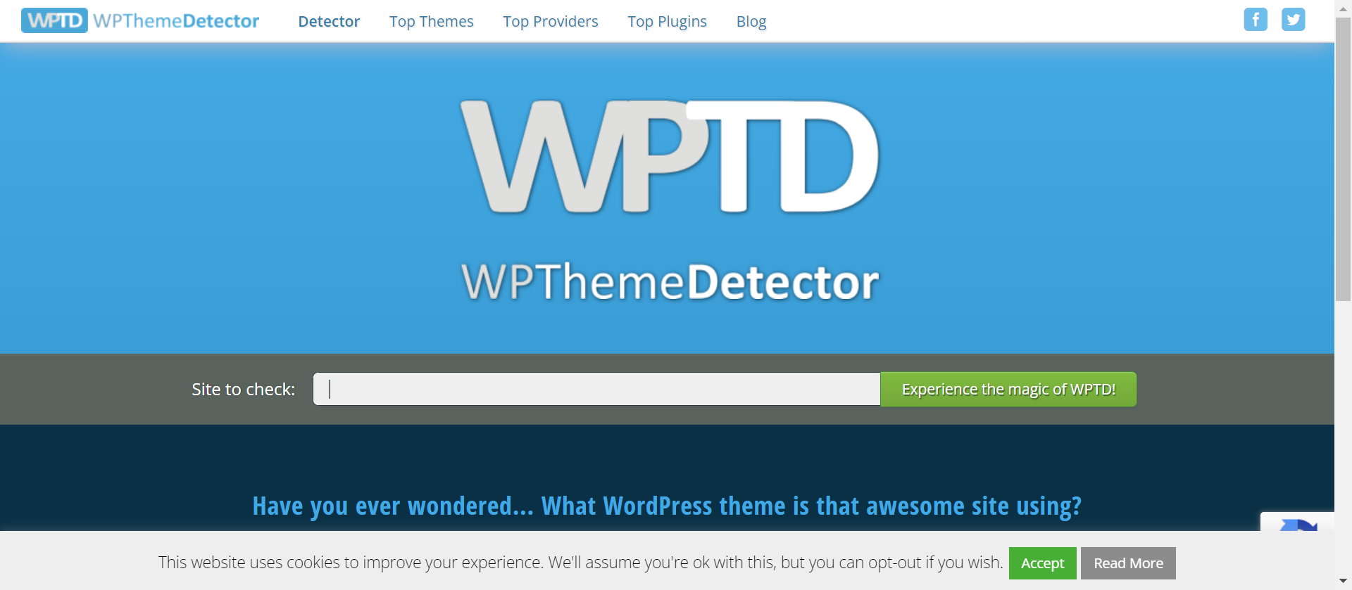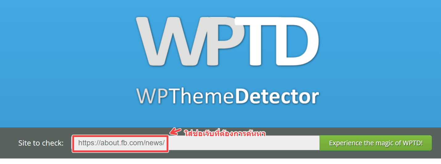 เริ่มแรกให้คุณเข้าไปที่เว็บไซต์ชื่อว่า wpthemedetector.com ซึ่งเป็นเครื่องมือออนไลน์ที่ช่วยค้นหาข้อมูลเบื้องต้นของเว็บไซต์ที่สร้างด้วย WordPress เมื่อหน้าเว็บโหลดขึ้นมาแล้ว ให้คุณพิมพ์ชื่อ URL หรือที่อยู่เว็บไซต์ที่คุณต้องการตรวจสอบลงไปในช่องค้นหา จากนั้นให้กดปุ่มเพื่อให้ระบบเริ่มประมวลผล