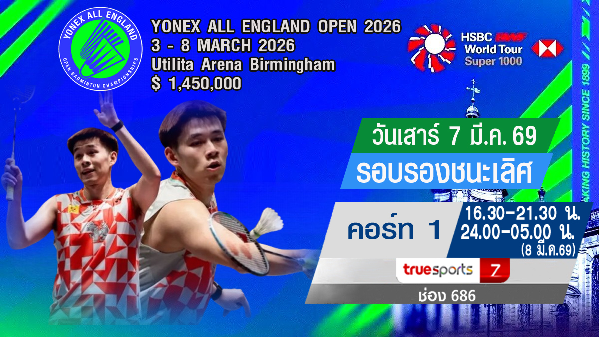 เชียร์สด ! แบดมินตัน YONEX All England Open Badminton Championships 2026 : รอบรองชนะเลิศ (7 มี.ค.69) (คู่แรก 16.30 น.)