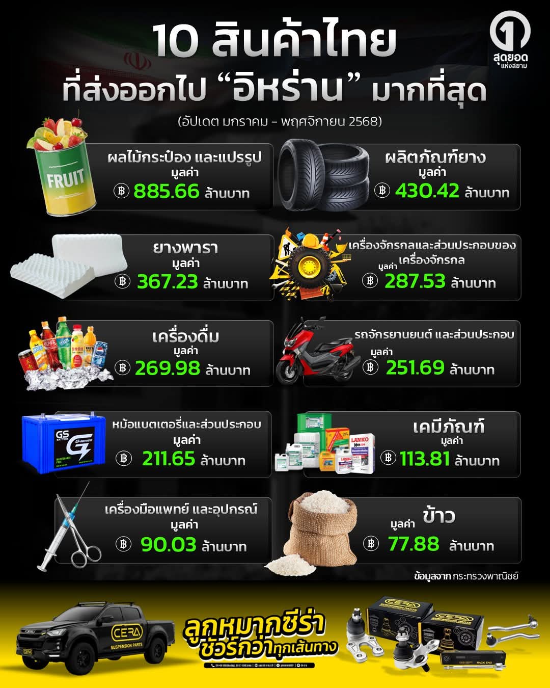 10 สินค้าไทย ที่ส่งออกไป “อิหร่าน” มากที่สุด (อัปเดต มกราคม - พฤศจิกายน 2568)