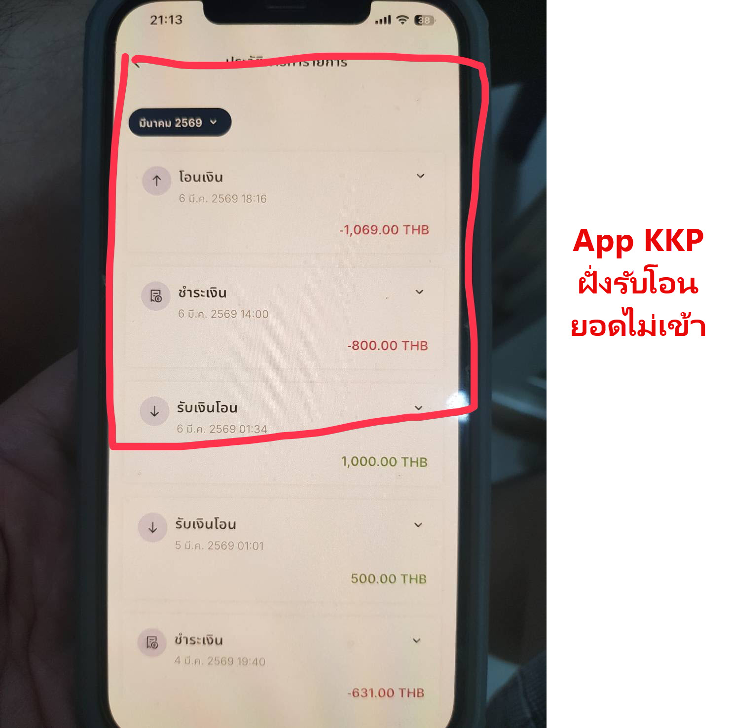 วันนี้ประมาณ 6.00 น. ตื่นมาโอนเงินจาก scb ไป kbank บัญชีตัวเอง 4 ยอด แต่ยอดไม่เข้าปลายทาง (สามยอดหลังลองโอนรอบละ 1 บาท) แต่โอนจาก kbank ไปย scb ยอดเข้าปกติ 2 ยอ