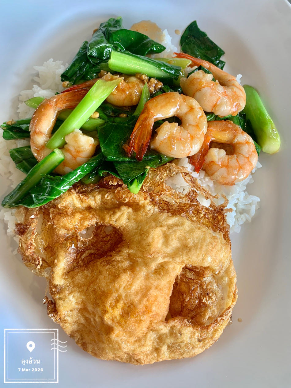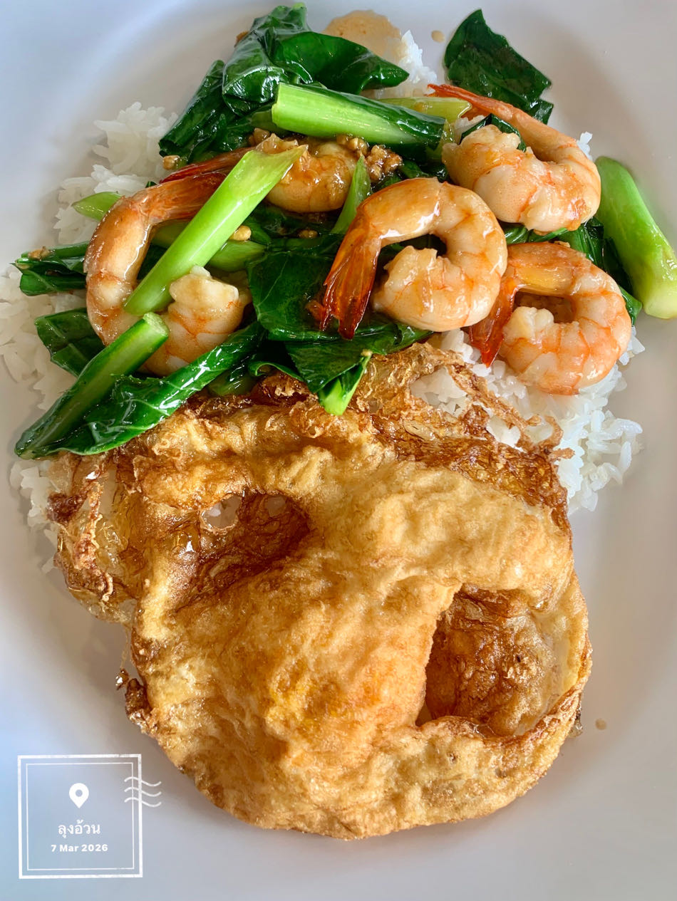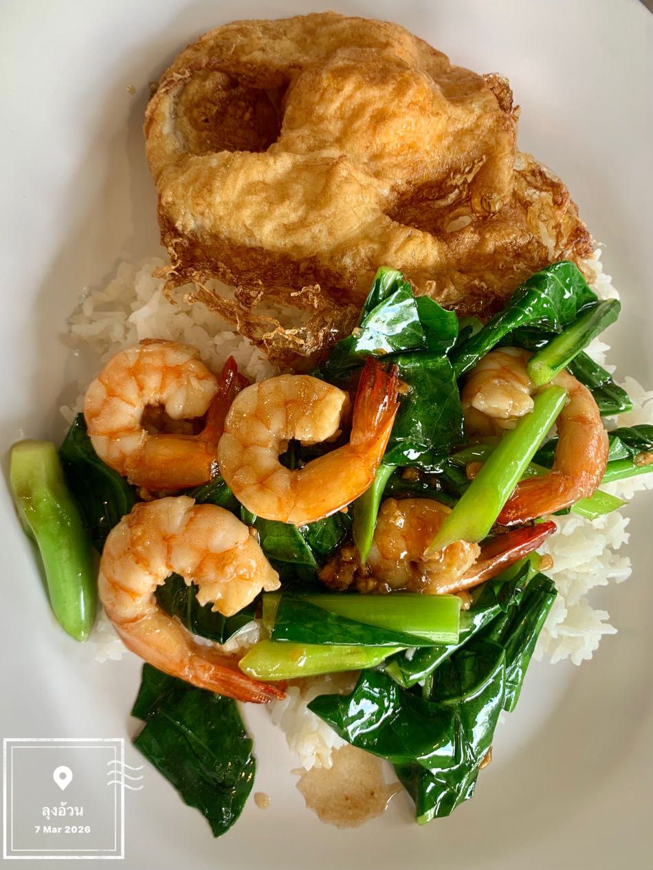 คะน้ากุ้งราดข้าว+ไข่ดาวกรอบ