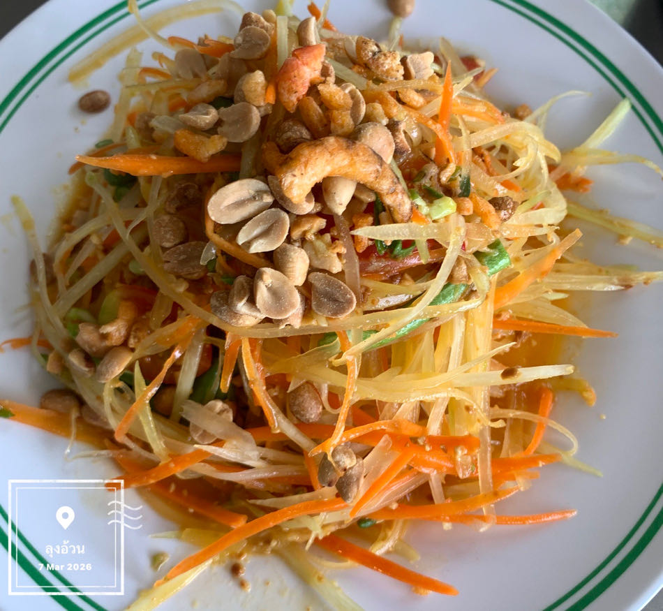 ส้มตำไทย ตำถั่วจนแหลก น้ำขุ่นไป ลดความลำลง