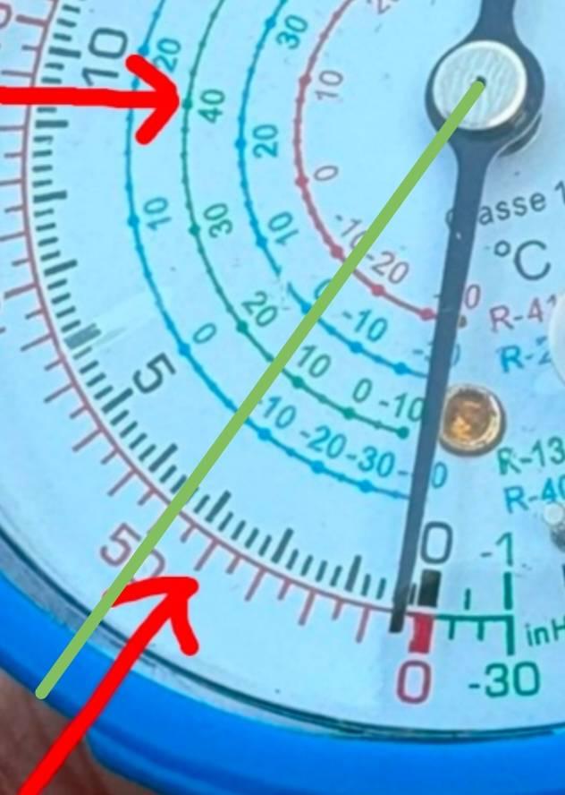 พอดี ดูช่อง youtube ที่สอนเติมน้ำยาคอมแอร์ รถ R134A แล้วดูที่เกจ เห็นว่าเติมระหว่างที่ 35-40