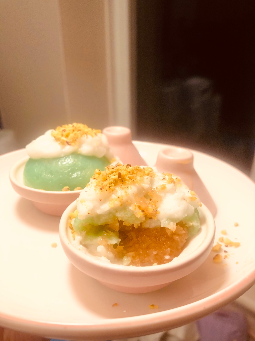 ห่อมาเหมือนห่อข้าวต้มมัด แต่ชิ้นใหญ่ ตรงส่วนสีเขียว กินแล้ว รสชาติเหมือน กินขนมข้าวต้มละวุ้นค่ะ จืด แต่ก็มีความหวานของตัวแป้ง (น่าจะเป็นข้าวเหนียว มั้งนะคะ) น