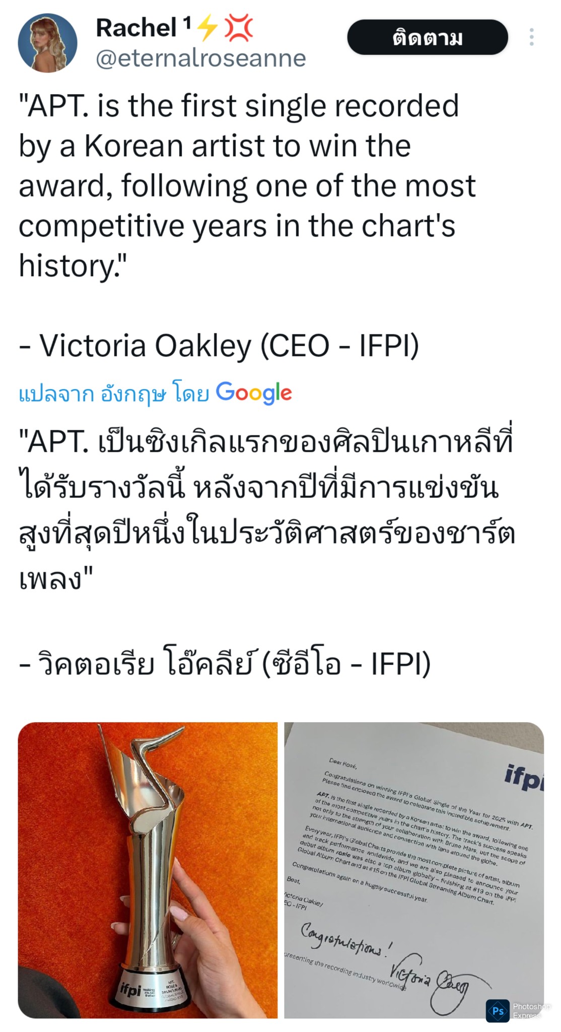 ข้อความบางส่วนจากหนังสือแสดงความยินดี "เพลง APT. เป็นซิงเกิลเพลงแรกจากศิลปินเกาหลีที่ได้รับรางวัลนี้ (ขอเพิ่มเติมนอกจากนั้นยังเป็นเพลงแรกที่มา