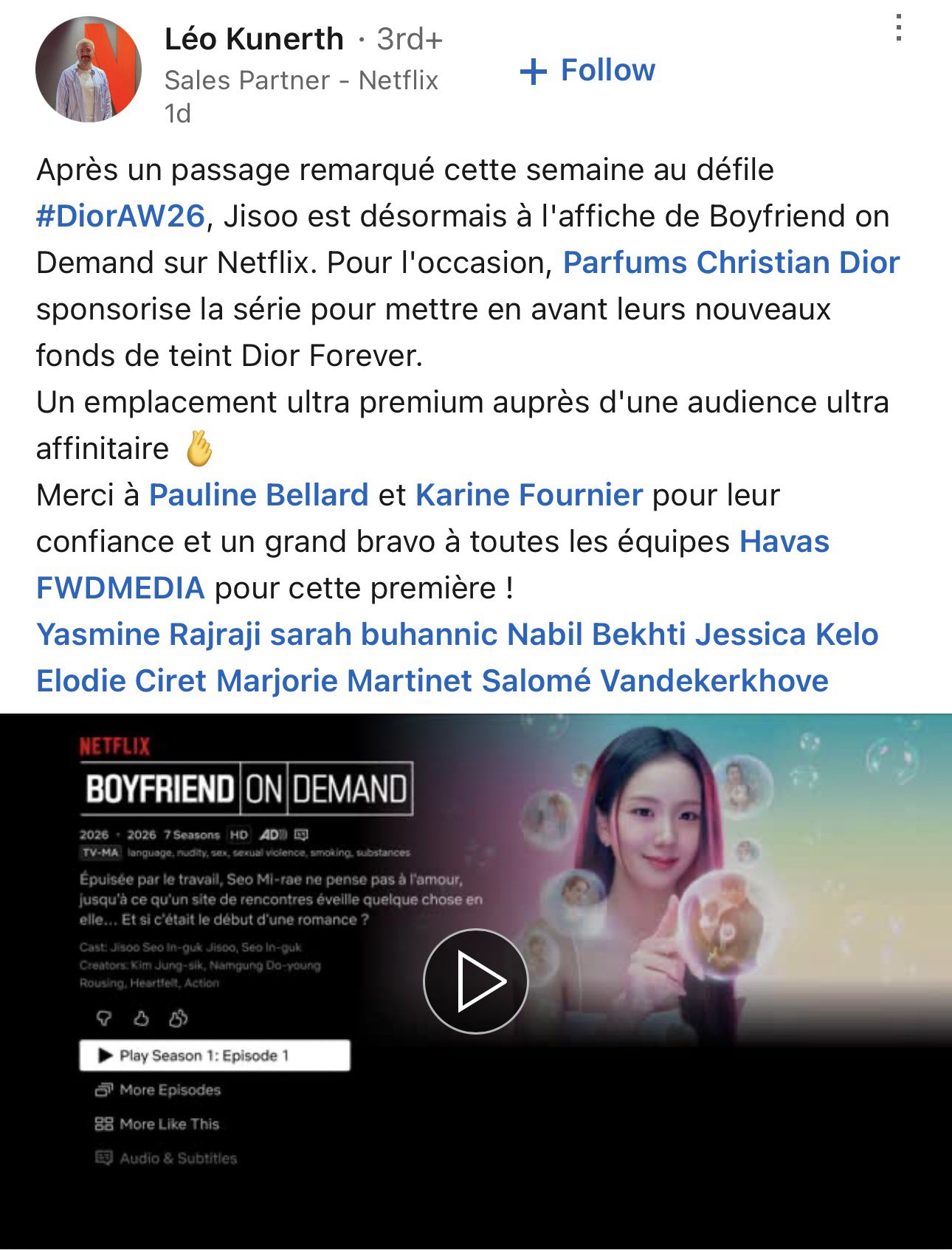 Léo Kunerth, sales partner ของ Netflix ประกาศว่า แบรนด์ Christian Dior เป็นสปอนเซอร์หลักอย่างเป็นทางการให้กับ ซีรีส์ Boyfriend on Demand ถือว่า JISOO สมฉายา เจ้าหญิงดิออร์ อย่างแท้จริง แบรนด์ดิออร์รักมากตามมา support ถึงขนาดนี้ ซีรี่ส์เรื่องนี้ก็กำลังดังมากด้วย นี่เพิ่งดูจบ อินมากดีงาม