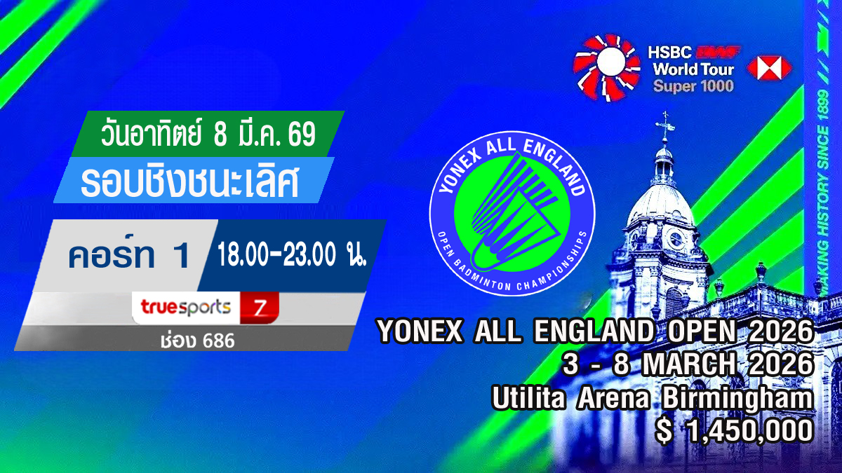 เชียร์สด ! แบดมินตัน YONEX All England Open Badminton Championships 2026 : รอบชิงชนะเลิศ (8 มี.ค.69) (คู่แรก 18.00 น.)